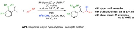 WP4: With the aim of exploring the potential wide utility of HA reactions in the synthesis of target compounds, we have developed a new and robust methodology to deliver highly substituted and optically active ketone products from the controlled assembly of three readily available fragments. We have exploited the use of a single rhodium complex to promote a sequential alkyne hydroacylation and boronic acid conjugate addition.