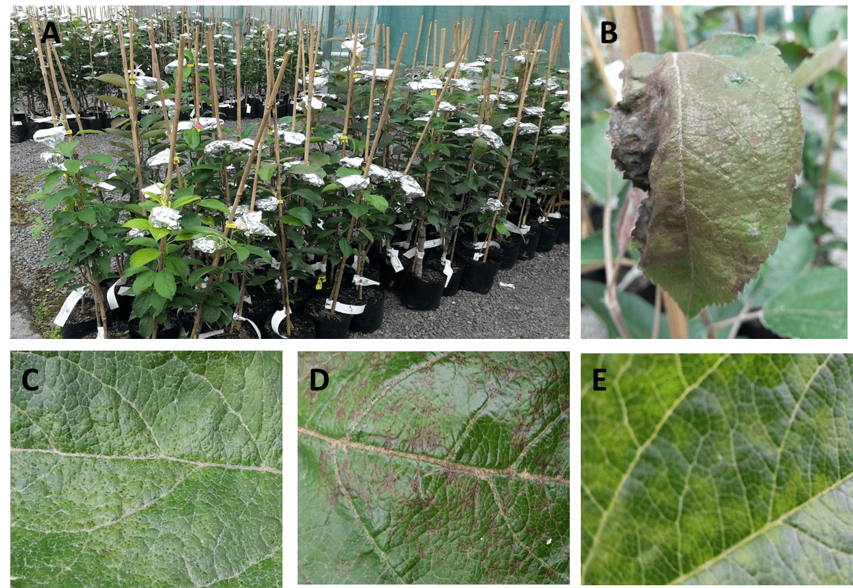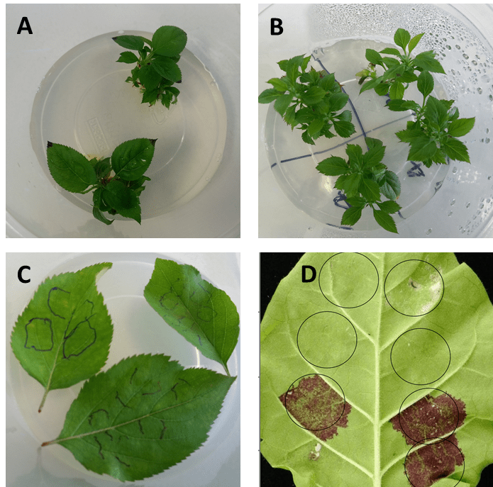 Research activity 4: Development of transient expression techniques in apple for the functional validation of CRG in ‘Geneva’. I would target functional RG identified in the Research activities 2 and 3 to transform a susceptible apple cultivar with the various CRG separately, or in pairs since pairs of CRG could be necessary to provide the recessive resistance. I would assess the effect of the plant transformation on the resistance phenotype by inoculating with well characterized monoconidial isolates of V. inaequalis (based on the Research activity 1). In collaboration with Dr Espley I have initiated setting up transient expression experiments using a Malus host. I transformed into Agrobacterium, various constructs initially developed for genes involved in the anthocyanin biosynthetic pathway of apple. Infiltration were made in tobacco leaves as a positive control, as well as into detached apple leaves grown in the greenhouse or in vitro. Each plant substrate showed various mechanical resistances to the infiltration being the tobacco leaves and detached apple leaves grown in the greenhouse the easiest to infiltrate. Red coloration has been observed in tobacco plants as well as in detached apple leaves grown in the greenhouse, but these latter one were not specific to the transient gene expression. Next, other infiltration methods would be tested, as well as more mature in vitro apple plants.