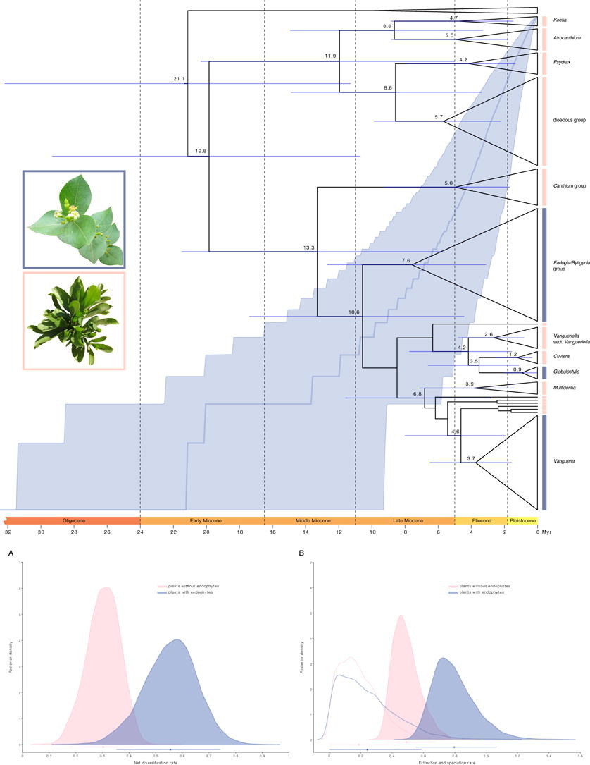 A first objective was to elucidate the likely origin in time of bacterial leaf symbiosis, which indicated when the interaction has been established. A second objective was to investigate whether the presence of endophytes had an impact on the diversification rates of the host plants because the hypothesis is that lineages with endophytes will have deviating diversification rates as a result of the symbiosis.