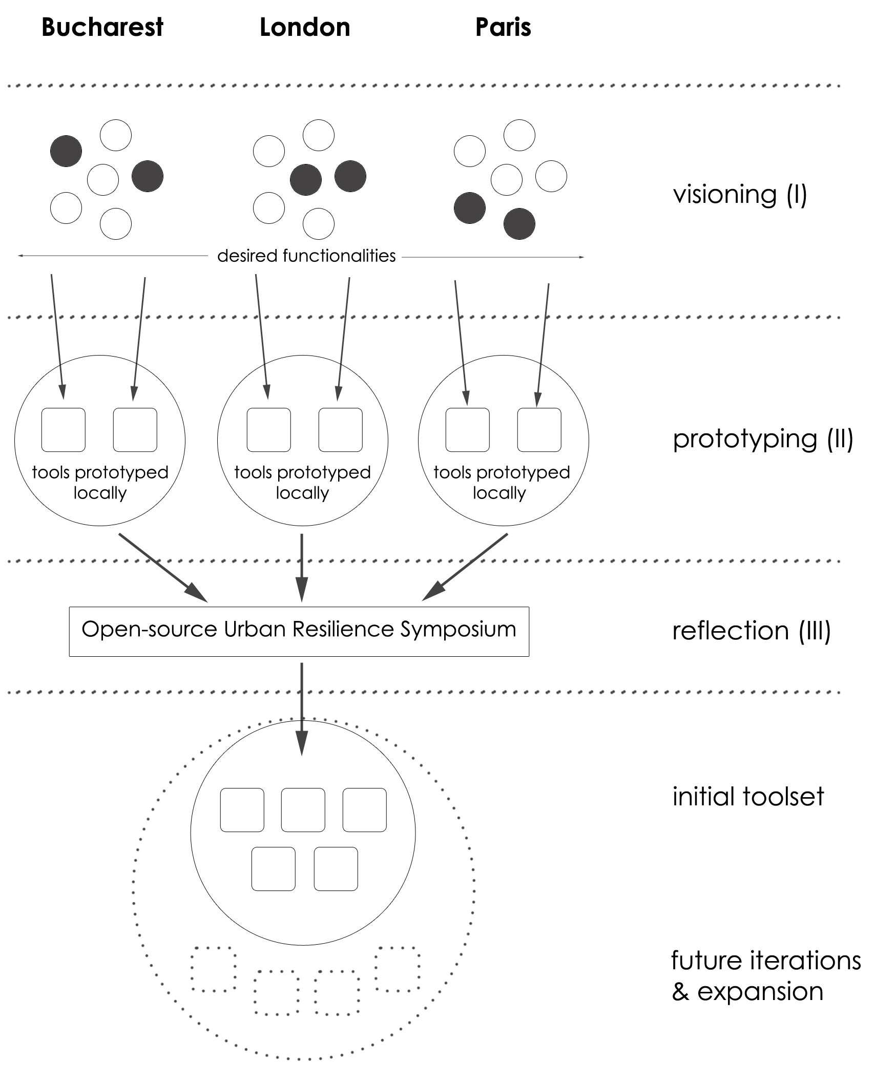• Stage 1 / Visioning carried out through collaborative mapping workshops with local practitioners and some of their collaborators to better understand what resilience means in each urban context and to define key needs for the tools that could be prototyped. The needs for tools are connected to the types of capacities that the participants considered necessary in order to enable them to advance their resilience practices at different scales.