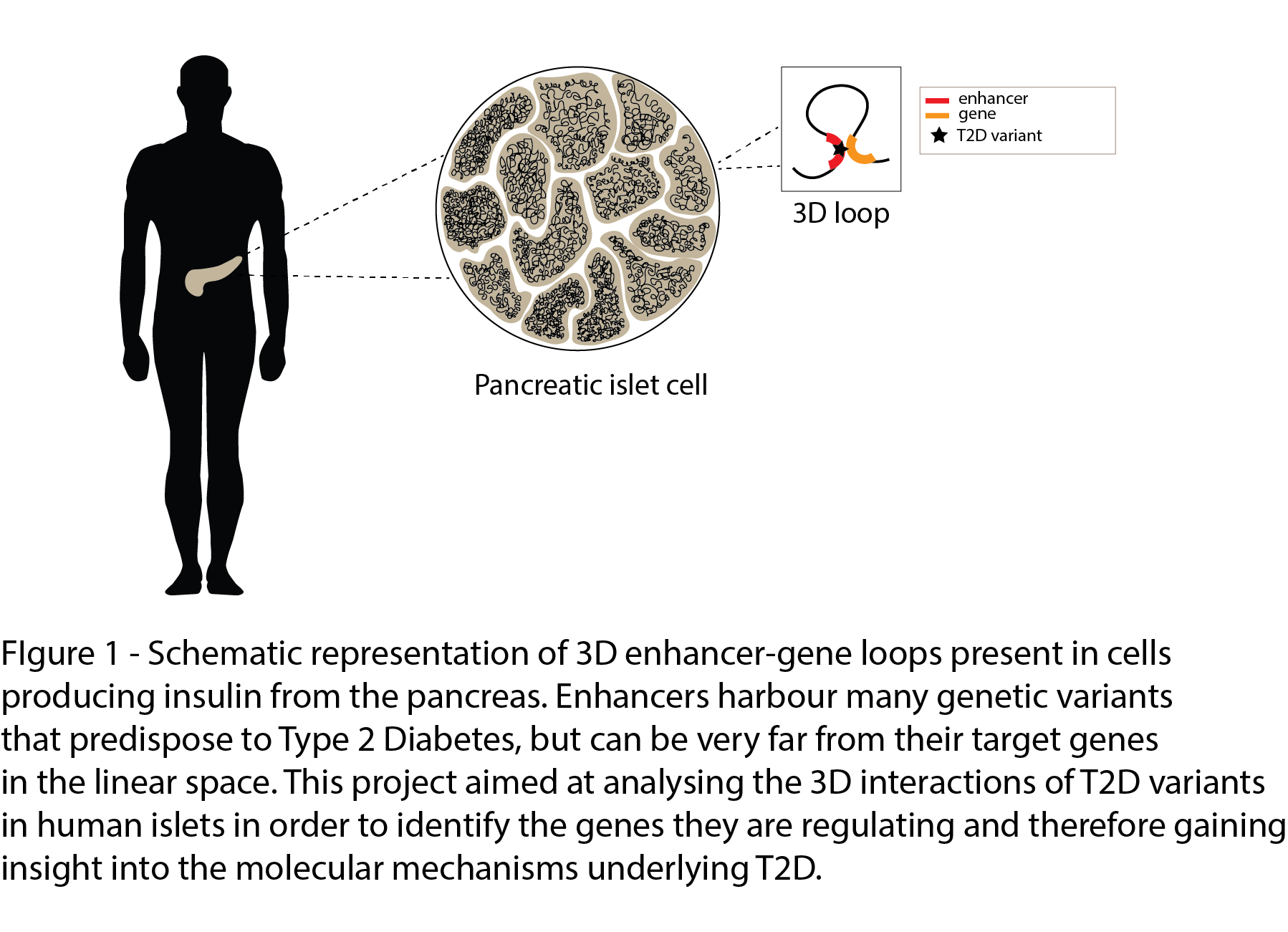 The tridimensional maps of human islets generated during this project have provided experimental evidence of existing physical links that connect genetic variants predisposing to T2D with their endogenous target genes. Some of the genes contacted by T2D variants are very far away in the linear DNA space and therefore were never predicted to be influenced by them. This project thus provides novel insights into the molecular mechanisms underpinning the disease. Furthermore, the identification of new putative causal genes of T2D susceptibility will assist efforts to develop refined therapies that involve modulation of transcription of target genes.