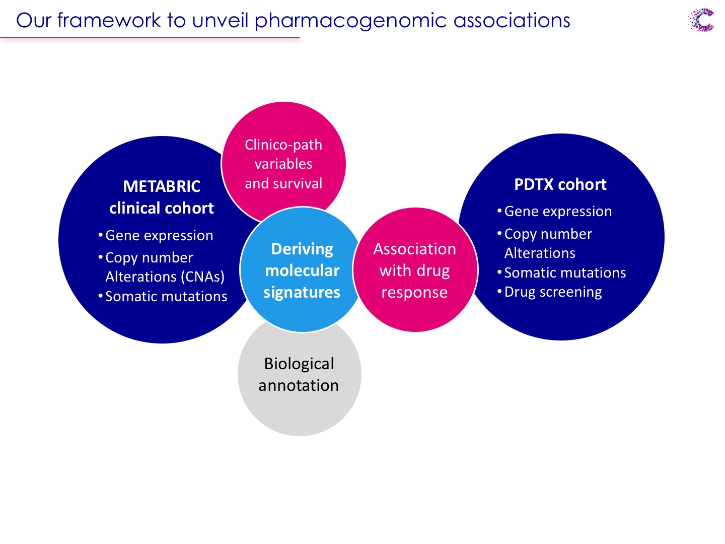 An analysis framework was developed starting from a large breast cancer clinical cohort where, taking advantage of the large samples size, a set of breast cancer specific molecular signatures were derived using two distinct approaches. The sets of molecular signatures identified using the two approaches were then tested for association with drug response in a patient-derived tumour xenografts (PDTXs) cohort, where both molecular data and drug response data were available. A number of significant correlations were found. Validation in independent models and experiments to understand the underlying biological mechanism are ongoing.