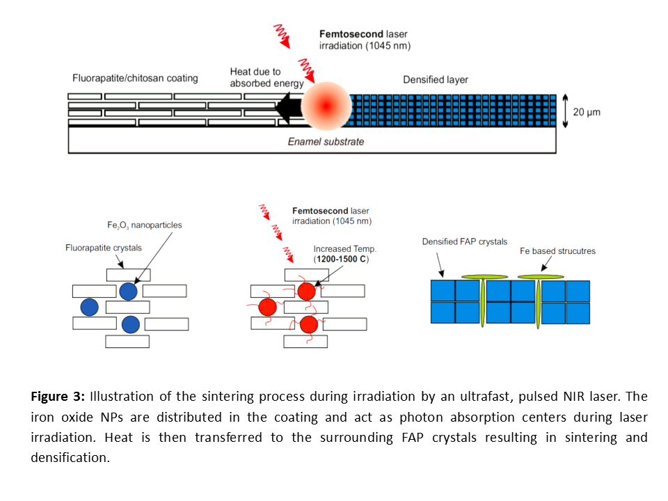 In genral a radical new methodology for the exogenous mineralization of hard tissues is demonstrated in the context of laser-biomaterials interaction. The proposed approach is based on the use of femtosecond pulsed lasers (fs) and Fe-doped calcium phosphate minerals (fluorapatite powder containing Fe2O3 nanoparticles (NP)). A layer of the powder is applied to the surface of eroded bovine enamel and is irradiated with a fs laser (1040 nm wavelength, 1 GHz repetition rate, 150 fs pulse duration and 0.4 W average power). The Fe2O3 NPs absorb the light and may act as thermal antennae, dissipating energy to the vicinal mineral phase. Such a photothermal process triggers the sintering and densification of the surrounding calcium phosphate crystals thereby forming a new, dense layer of typically ̴20 μm in thickness, which is bonded to the underlying surface of the natural enamel. The dispersed iron oxide NPs, ensure the localization of temperature excursion, minimizing collateral thermal damage to the surrounding natural tissue during laser irradiation. Simulated brushing trials (pH cycle and mechanical force) on the synthetic layer show that the sintered material is more acid resistant than the natural mineral of enamel. Furthermore, nano-indentation confirms that the hardness and Young’s modulus of the new layers are significantly more closely matched to enamel than current restorative materials used in clinical dentistry.