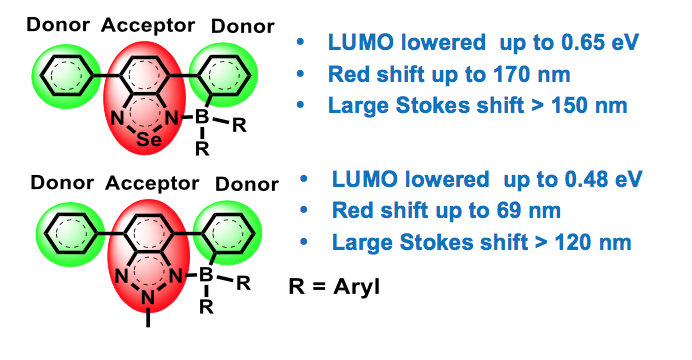 This simple two-step, one-pot procedure is applicable to a wide range of small molecules and polymers containing benzothiadiazole type acceptors. It leads to a significant increase in the electron affinity of the product and a considerable reduction in the band gap, consistent with near-IR emission in OLEDs, ambipolar OFET mobility, improved n-type stability and effective light harvesting in OPVs. The overall aim of BORCOM was to develop new molecules and polymers with higher electron affinities and reduced band gaps by functionalization of azole and azine containing acceptors in the conjugated backbone.