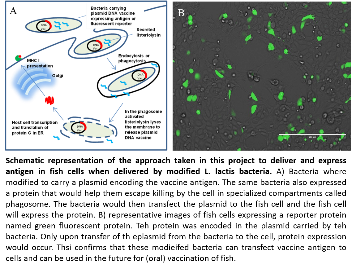 In this project we succeeded to show that modified L.lactis can deliver the SVCV-G antigen to carp cell lines in vitro and to zebrafish larvae in vivo.