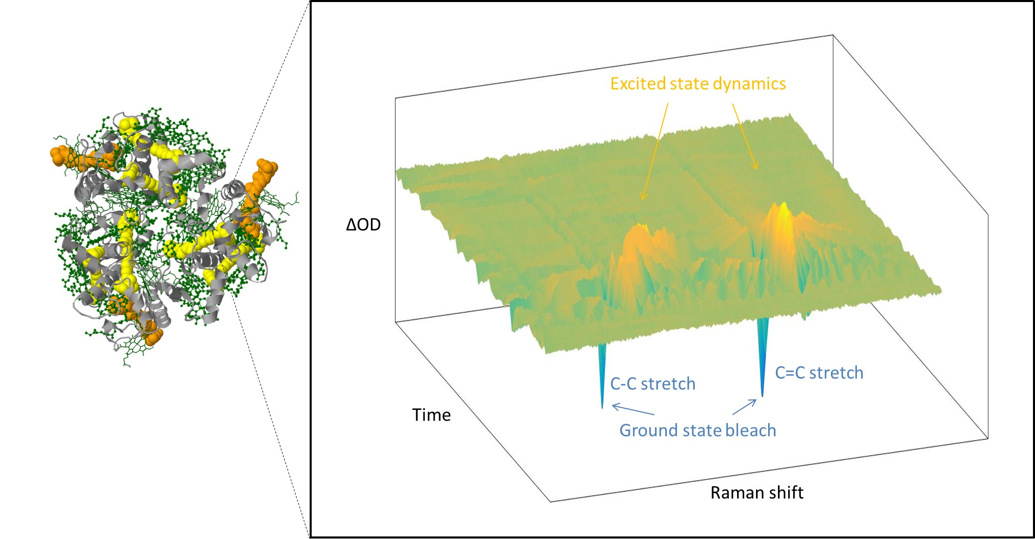 Vibrational spectroscopies have allowed the detailed study of some of the molecular vibrations of the different pigments in PS. In particular, Raman spectroscopy has permitted establishing fingerprints for the Cars in PS samples. Also, energy transfer dynamics in PS have been extensively studied using a variety of techniques, including transient absorption spectroscopy (TAS). In combination with analysis schemes, TAS has allowed mapping the excited states of PS to a great extent. Unfortunately, some states (that may play roles in regulatory mechanisms) could be “dark” states, being not accessible to TAS, and vibrational spectroscopies could help fill this gap. A combination of these approaches (TAS and Raman), femtosecond stimulated Raman (fs-Raman) was developed. Fs-Raman is challenging since it requires separating the Raman signal from a transient absorption envelope with a good signal-to-noise ratio (SNR). To overcome these limitations and enable the study of complex samples with high resolution, in our lab we have developed a variation of the technique based on spectral watermarking that allows recovering the fs-Raman response with a high SNR. Briefly, the experiment is done using a shaped broadband pulse instead of a narrowband Raman pulse, allowing locking a watermark to the Raman signal.