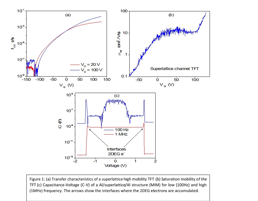 Everyone who can view this summary on a personal or laptop computer with a flat panel display uses Thin Film Transistor (TFT) technology. Exploitation of TFT technology allows the industry to fabricate low-cost applications widely used in everyday life by the vast majority of people on earth such as flat panel displays, sensors and simple electronic circuits. The most common application of a thin film transistor is as the switch of a pixel of a flat panel display permits or not the light to reach our eye and is produced by depositing a semiconducting layer on a dielectric layer over a transparent substrate. Progress in TFTs has been based primarily on the development of new materials and on implementation of innovative device architectures together with new material combinations. Decreasing the cost of fabrication processes, the ability to fabricate transistors in large scale and the enhancement of the transistor performance are the most important aspects of the technology. Solution based fabrication techniques which have been developed the past few years allow us to achieve fabrication of large area electronics on flexible transparent substrates due to low temperature processing, with low fabrication cost using low cost equipment. More importantly, they are ideal for producing low-dimensional films. Two of the simplest and cost-effective deposition techniques used in this project are the spin casting and spray coating. In spin casting, the solution containing the semiconductor or the dielectric material is casted on a substrate and then is spread by spin for a few seconds, while in spray coating the solution is sprayed on the substrate. The final step of the fabrication process is to anneal the samples at temperatures that are compatible with plastic substrates, below 200°C, in order to convert the solution on the substrate into a solid semiconductor film. Fully soluble metal oxide materials, offers the ability to fabricate TFTs with a high mobility beyond the established silicon technology used until today and thus potentially replace the current technology.  However, we are still far away from that point where a single layer of metal oxide semiconductor can reveal a mobility high enough so as to exceed the mobility of silicon transistors. This is mainly due to poor quality of the semiconducting film and the maximum mobility limitations by the intrinsic properties of the semiconductor employed restricting the performance of the transistor. On the other hand, the fabrication techniques that have been used for high quality inorganic films are expensive, complicated and demand high processing temperature and therefore makes them inappropriate for fabricating electronics on flexible substrates. SUPERSOL addresses the challenge of fabricating solution-processed metal oxide TFTs on flexible substrates exhibiting a high mobility which exceeds the mobility of silicon technology prevailing until today. Spin casting and/or spray coating fabrication techniques have been used to deposit metal oxide semiconductors like ZnO, In2O3, Ga2O3, InxZnyOz with carrier density changing at will, dielectric films like ZrO2 and Al2O3 and solutions containing mixed semiconductors like ZnO and In2O3 nanoparticles. In order to overcome the intrinsic semiconductor mobility limits, the project has combined the advantage of charge carrier confinement appears at the interfaces of multiple inorganic semiconducting layer structures with the advantages of simplicity and low-cost solution fabrication processes to enhance the mobility of the transistors. SUPERSOL investigated the underlying conduction mechanisms of the multiple layer transistor structures in order to uncover the aspects leading to high mobilities and took advantage to develop high mobility thin film transistors exceeding the mobility limits until today. Finally, the project has delivered optimized multiple layer transistors and other electronic devices like memristors and resonant tunnelling diodes. In conclusion, SUPERSOL has developed and demonstrated novel high mobility solution processed metal oxide thin film transistors on flexible substrates that will benefit the relevant technology by breaking the transistor mobility limits and lower the production costs for large area electronics industry. Potentially, it will lead to high-end products, more easy to use, to a huge variety of every day applications that will have a large impact to society. A brief summary of a few key results of the SUPERSOL project are illustrated in Figure 1.