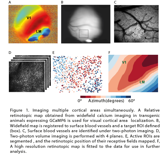 Our second work package included the functional mapping of two cortical areas, and assessment of the border zone between the two. We performed these experiments at the border between primary visual cortex and the Lateral-Medial higher visual area in mice. We located this border with widefield calcium imaging and followed up with cellular-resolution two-photon calcium imaging (Figure 1.) During these experiments animals were head-fixed, but free to locomote on a cylindrical treadmill and passively viewed visual stimuli. We found with both methods that the spatial extent of the retinotopic transition zone is on the scale of dendritic arbor widths, meaning that it is a fairly sharp border topographically. Next we measured the precision of the border in terms of tuning for simple visual features. These experiments revealed that the gradient of visual tuning preferences at the border is gradual. We further adopted more unbiased analytical approaches using classification of neurons into areas based on statistical features their activity, and explicit measurement of the correlations between pairs of neurons. Most of these analyses revealed activity across two cortical areas to be highly correlated, and the border between them to be gradual. In the process of these experiments we found that the topographic precision of the border, as well as other important features of activity depend on cortical layer. Cortical layers are composed of neurons that differ in many ways. Importantly for us, they differ in dendritic morphology and physiology, and our observations suggested that some of these differences may have a strong impact on cortico-cortical communication. This has led us to investigate the relationship between cortico-cortical communication and dendritic recruitment.