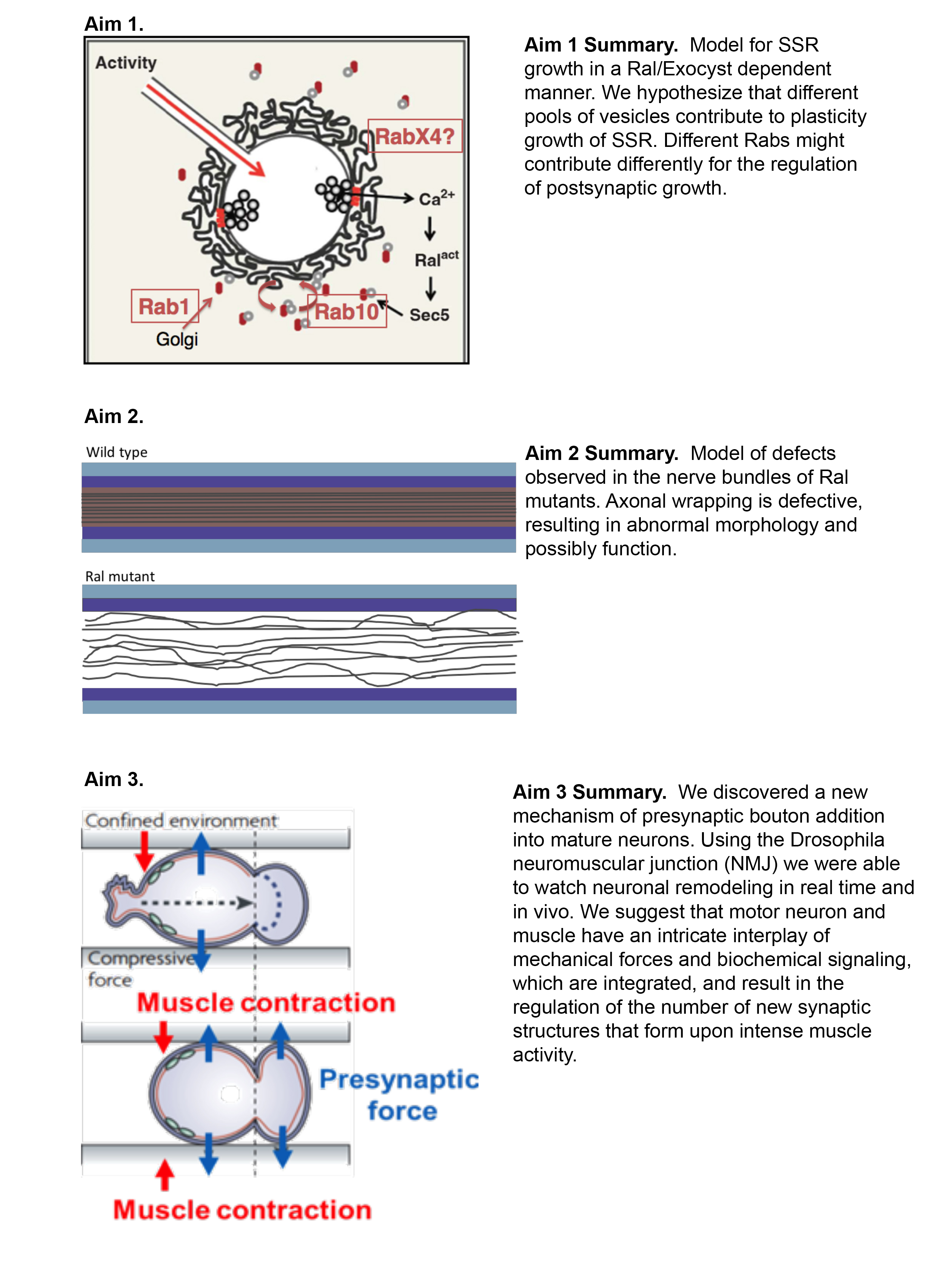 From these studies, we concluded that no single RabCA over-expression could mimic RalCA. We characterized the distribution of all Drosophila Rabs at the NMJ in the several SSR size backgrounds, and now have a complete picture of the expression profiles of these central traffic regulators, which can guide our future studies. Finally, we identified 3 Rab-GTPases that are required for Ral-dependent Sec5 recruitment to the NMJ. We are now unveiling how these Rabs are interacting with Ral and testing if they contribute to different aspects of synaptic growth.