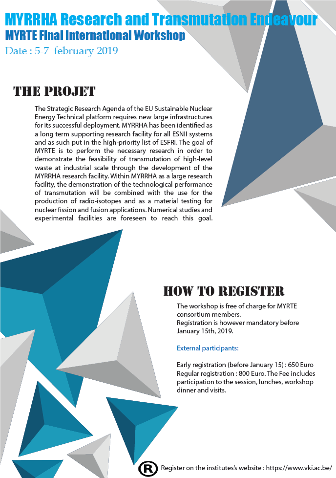 In order to disseminate and communicate the different achievements obtained during the project, an international Workshop on “Accelerator driven HLM nuclear reactor for transmutation and high-tech applications” was held at the von Karman Institute in February 2019.
