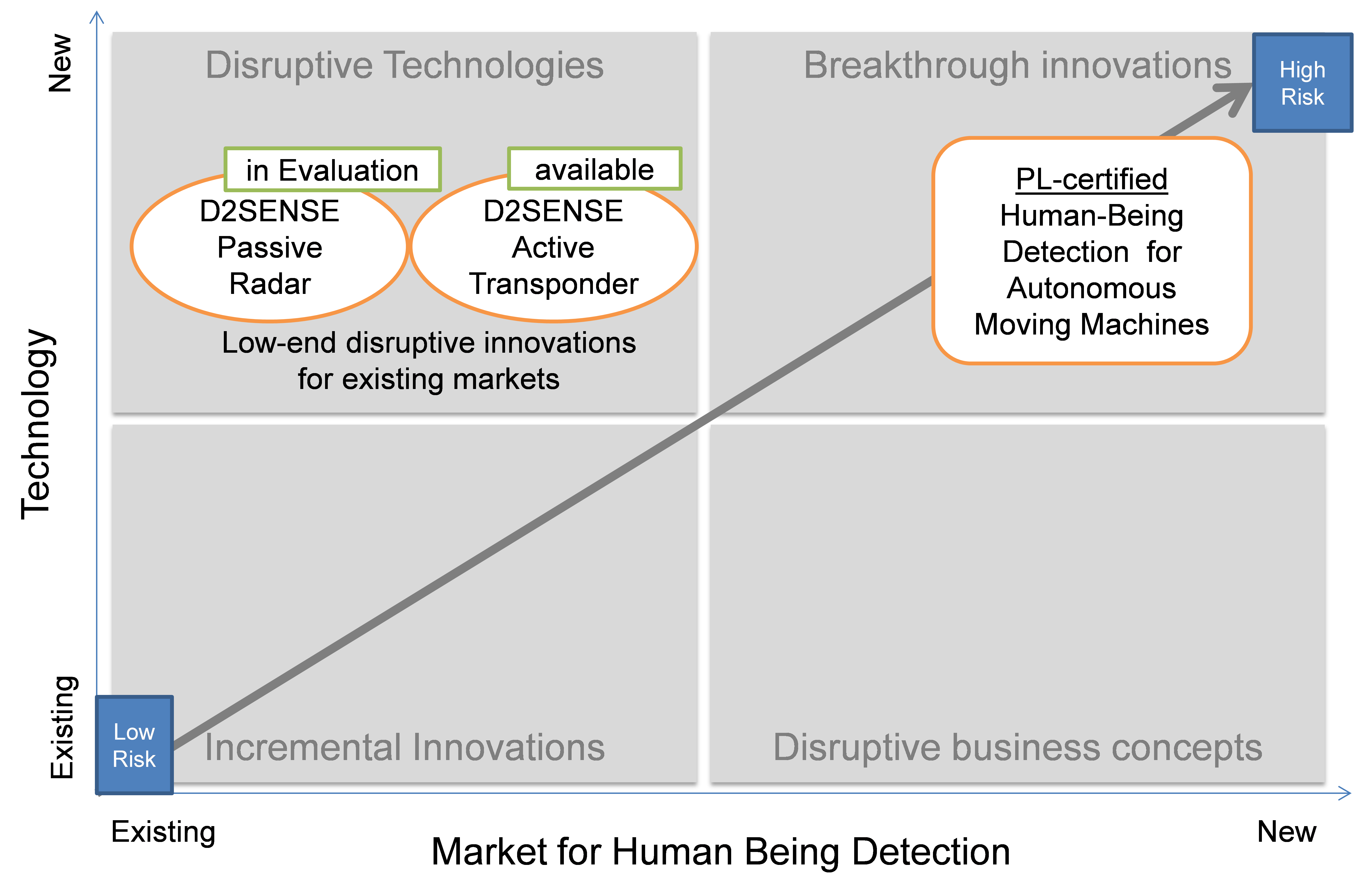 Assigned in Mobility to Growth area, the enhancement of the D2SENSE ranging system through the introduction of performance level opens a niche segment, which will develop and grow very fast within next few years. Combining two highly reliable human being detection systems, one passive and the other active, will result in a key enabling technology for outdoors autonomous moving machinery by providing exact location information of workers in the danger zone, independently from outside conditions. This represents the unique selling proposition of Comnovo, providing a noticeable and sustainable competitive advantage.