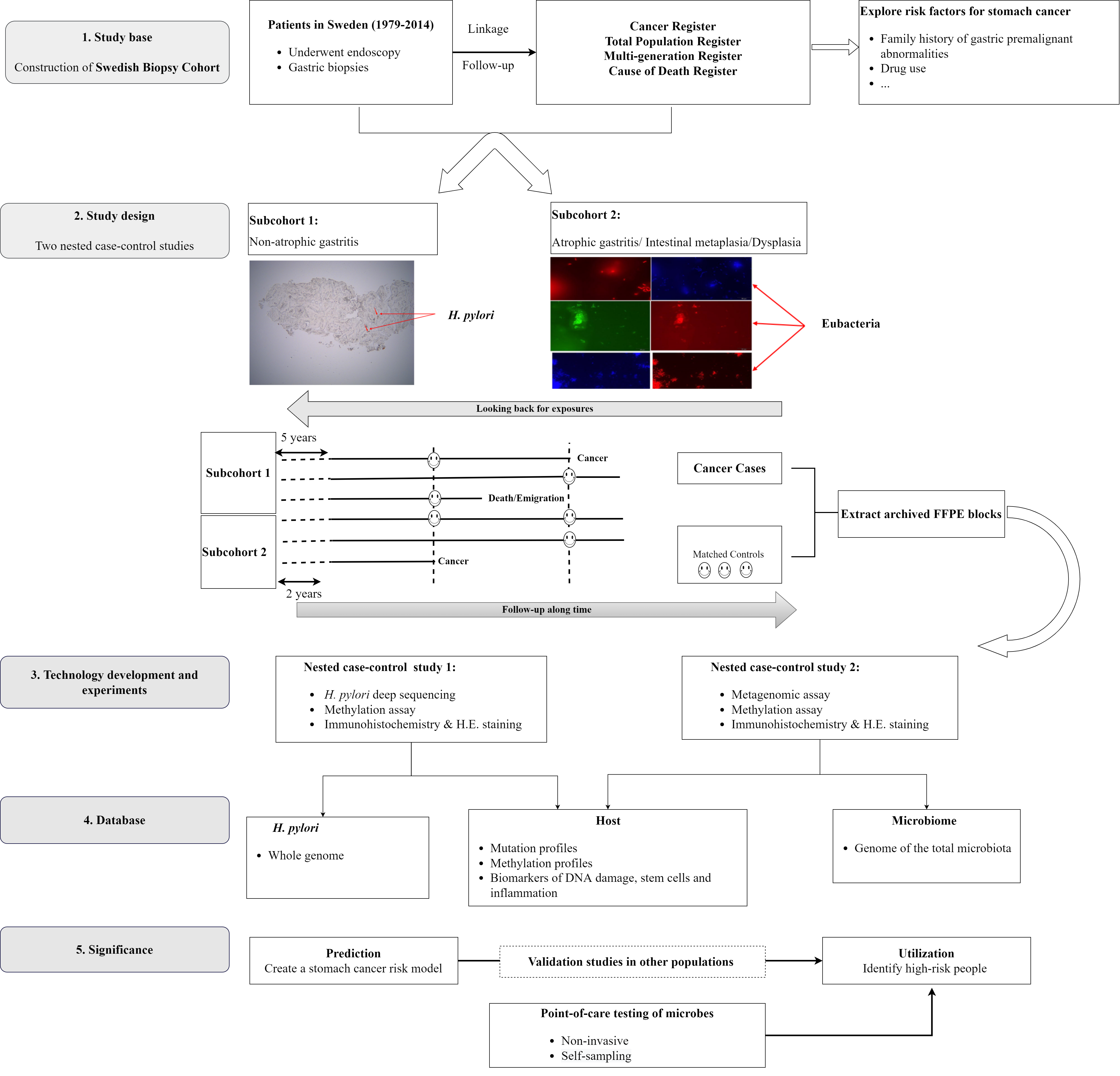 We created a cohort from Swedish computerized pathology registers, comprising of patients who underwent endoscopic examination with stomach biopsy between 1979 and 2014. This cohort was linked to Cancer Register and other health and demographic registers to identify stomach cancer cases and to obtain necessary information for censoring. We then conducted two nested case-control studies, among subjects with non-atrophic gastritis and atrophic gastritis (or more severe lesions), respectively. For paired stomach cancer cases and controls, formalin-fixed paraffin-embedded tissue blocks from baseline endoscopy were retrieved. We developed various methods for constructing Helicobacter pylori genome, metagenomics analysis, identification of mutation and methylation profile, and assaying biomarkers of DNA damage, stem cells and inflammation, which are tailored for long-term archived tissue blocks. We applied these technologies to the archived tissue samples, and created a unique database enabling us to understand gastric carcinogenesis and identify risk stratification markers. Besides, we developed a loop-mediated isothermal amplification assay for Helicobacter pylori detection using non-invasive and self-sampling methods, which are suitable in low-resources populations. We have also used a population-based case-control study to create a stomach cancer risk prediction model, which awaits to be further developed. Results from our paper have been adopted in updated guideline for management of patients with gastric lesions by Swedish Gastroenterological Association, and presented in several seminars.
