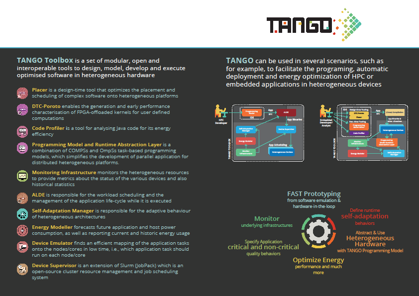 TANGO includes a programming model with built-in support for various hardware architectures that abstracts the complexity of developing for multiple architectures, including heterogeneous clusters, heterogeneous chips and programmable logic devices. TANGO creates a new cross-layer programming approach for heterogeneous parallel hardware architectures featuring automatic deployment on different scenarios and code generation including software and hardware modelling.