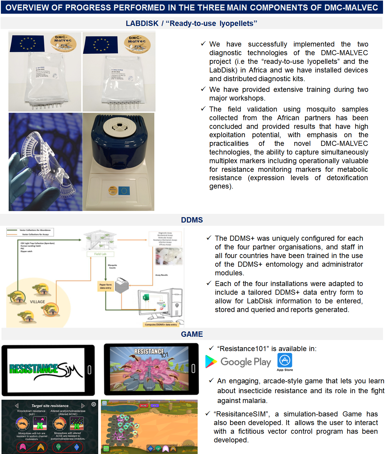 DMC-MALVEC contributed to innovation capacity on several levels: 1. The diagnostic tools analyze mosquitoes for determining their species, infection status and resistance to insecticides. 2. The DDMS can be used not only in central laboratories but also at the point-of-need. 3. The interfacing of the diagnostic platform with the DDMS and the GAME provides a highly added value to all these individual components.