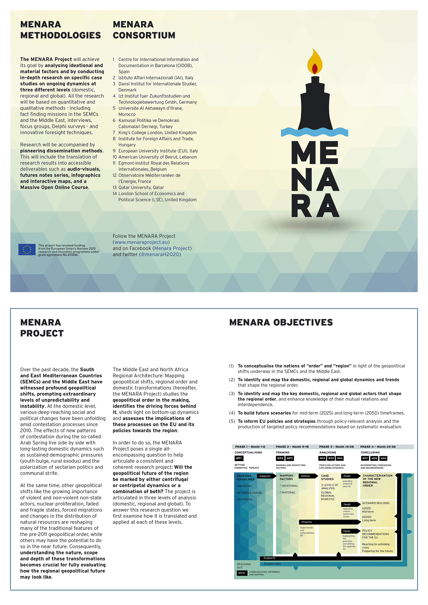 During the whole duration of the project communication has been fundamental pillar of this collective endeavour. MENARA reached out to different audiences, thus bridging the gap between policy, research and practice. The dissemination activities have been fully integrated in the research activities. The projects website has been constantly updated. Every two months, MENARA has sent a newsletter to more than 13.000 subscribers summarizing all the research activities and events conducted by the researchers within the project. Also, the research activities have been disseminated through the social media, Twitter (@MenaraH2020) and Facebook (Menara2020). The researchers also delivered informed comments to several media outlet in Europe and the MENA region and have written Op-ed for the MENARA blog on the Huffington Post Maghreb.