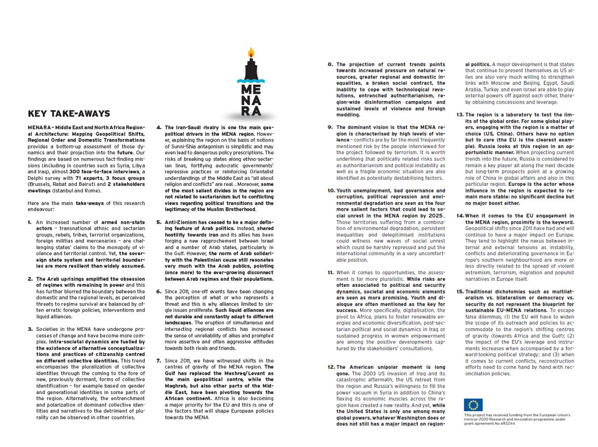 This project has been designed and implemented in a context in which the region has become more volatile and the EU has become more aware of the importance of this region. MENARA depicts a situation in which regional conflicts proliferate and intersect, where different local, regional and global actors have a say and forge liquid alliances among them and where the effects of instability in the region reach Europe in different forms. Researching this complexity has been a challenge but also one of the added values of this project.