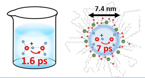 We studied the vibrational and structural dynamics of hydrated protons in reverse micelles using polarization-resolved femtosecond infrared transient absorption spectroscopy. We find that in small nanodroplets with a diameter <4 nm proton hopping is more than 10 times slower than in bulk water. Even in big nanodroplets of ~8 nm diameter, we find that the rate of proton hopping is slowed down by at least 4 times in comparison to bulk water (manuscript in preparation). For the anionic reverse micelles we observe additional transient absorption bands that we assign to the complexes formed by protons and the negatively charged sulfonate group of the AOT surfactant molecules (manuscript in preparation). ACS Cent. Sci. 2020, 6 1150–1158 (2020)