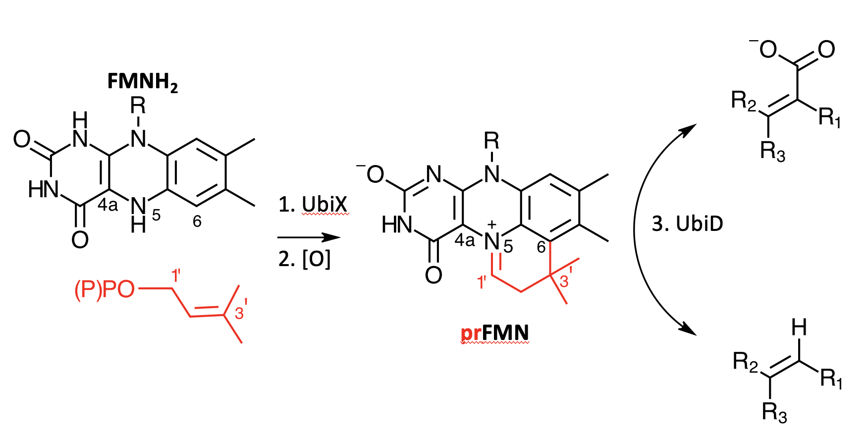 Our discovery of a new cofactor, derived from the flavin FMN opened up a new area of research, and associated scope for development of novel green chemistry to underpin the burgeoning bioeconomy of the future. This new cofactor is obtained through prenylation of the FMN molecule, leading to prenylated FMN or prFMN. This chemical modification completely alters the properties of the FMN molecule, and affects a true metamorphosis. The prFMN form an integral part of the wide spread microbial UbiD/UbiX enzyme system. This consists of the prFMN-dependent (de)carboxylase enzyme UbiD and prFMN-synthesising UbiX. The reversible decarboxylation catalysed by UbiD is of considerable interest for two main reasons: one, it has the potential to contribute to CO2 sequestration/fixation (when used in the carboxylative direction), thereby converting alkene hydrocarbons to organic acids and two, when run in the decarboxylative direction (ie releasing CO2) it can be used to convert biomass derived organic acids to hydrocarbons (ie biofuels).