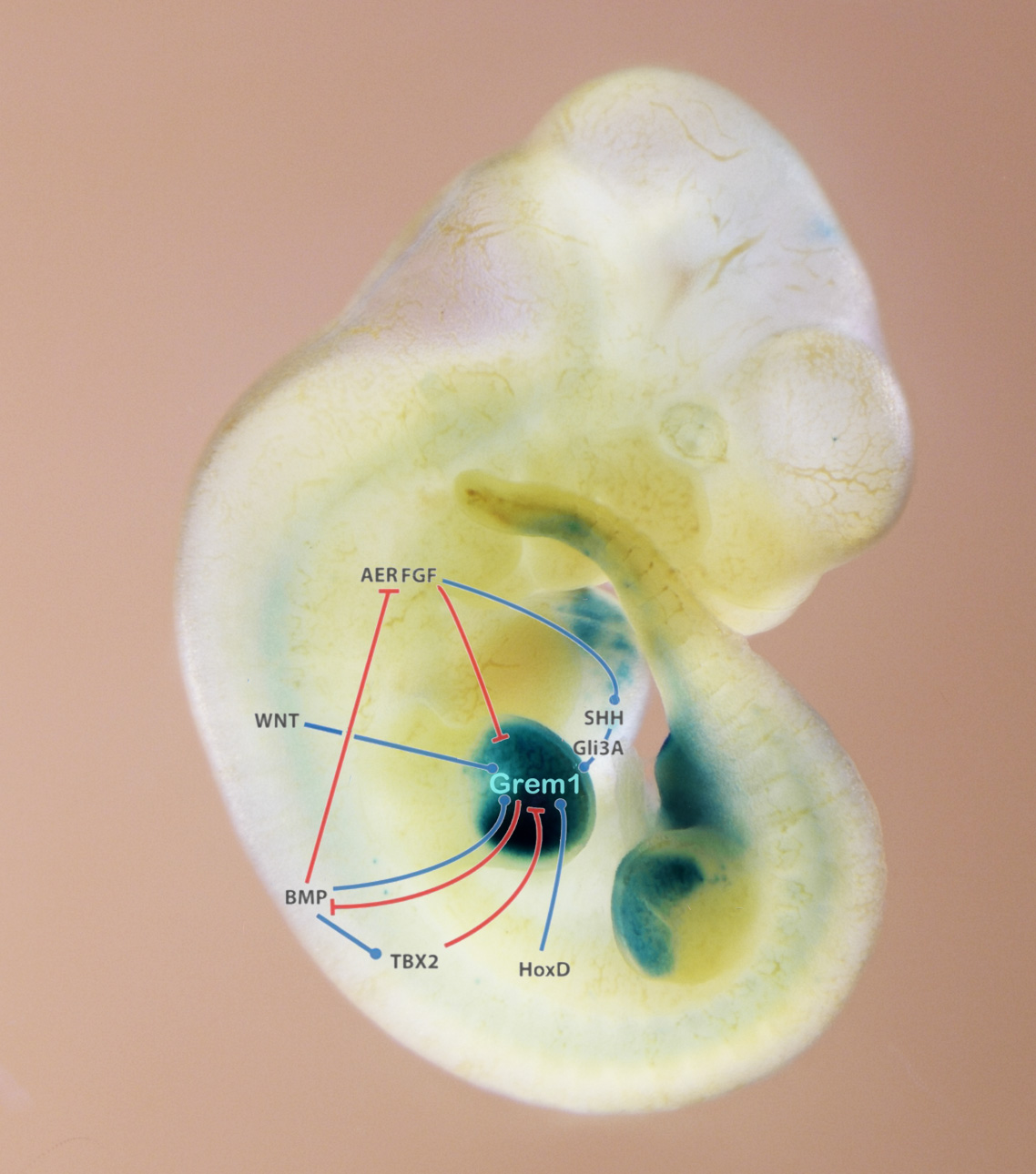 The developing limb of tetrapods (animals with four limbs) is a paradigm to study how gene regulation impacts morphogenesis. We have shown that a self-regulatory signaling system coordinately controls limb bud outgrowth and patterning of the limb skeleton and that the BMP antagonist Gremlin1 (Grem1) is essential to propagate this signaling system and for normal limb development. The ERC-funded research identifies several CRM enhancers embedded in a large genomic landscape and establishes how their interactions orchestrate Grem1 expression during mouse limb development. This analysis provides fundamental insights into how several CRM enhancers interact and integrate signaling inputs to regulate the spatio-temporal Grem1 expression. Genetic and molecular analysis identified a novel dual enhancer mode as CRM enhancers regulate Grem1 transcript levels in an additive manner, while their synergistic interactions provide the spatial regulation of Grem1 expression and digit development with robustness. During this analysis, we discovered that the Grem1 cis-regulatory landscape is deeply conserved in all vertebrates with paired appendages including evolutionary ancient fish. Functional analysis of two of the most conserved CRM enhancers revealed that their orthologues from basal fishes (Coelacanth and sharks) are strongly active in the mouse digit forming area, which is fascinating as it reveals that the regulatory circuits existed before fins evolved into limbs. Comparing CRM enhancer activities with Grem1 expression in limb buds from different mammalian and sauropsid species reveals the amazing evolutionary plasticity in Grem1 cis-regulation and expression, which correlates well with the evolutionary diversification of the limb skeleton in these species. This analysis indicates that the inherent robustness generated by the synergistic CRMs likely provided an evolutionary playground enabling diversification of enhancer activities during evolutionary adaptation of tetrapod limbs. In a parallel study we combined experimental with computational analysis of mouse limb and chicken wing buds to provide broad insights into how genome evolution impacted the cis-regulatory interactions and the spatio-temporal gene expression dynamics during diversification mouse limb and chicken wing development.