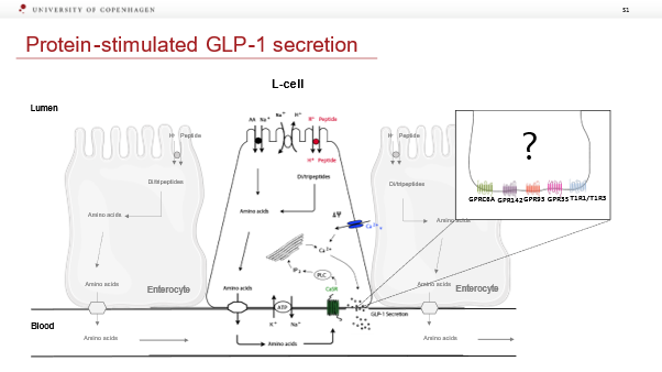 Surprisingly we found that the carbohydrate component of mixed meals is responsible for the strongest stimulation of GLP-1 secretion, whereas for PYY stimuli are more complex. Simple monosaccharides including glucose in particular are important, but more complex carbohydrates (e.g. isomaltulose) and also combinations with glycosidase inhibitors in healthy subjects can mimic the profiles after RYGB. We mapped the intestinal bile kinetics after RYGB and identified the bile salts as major players for both ileal and colonic hormone secretion. Bile and lipids are particularly important for neurotensin secretion, but even very high infusions rates of neurotensin had very little effect on appetite and food intake. Studies in RYGB and Sleeve Gastrectomy patients with bile acid sequestrants (cholesevelam) for several weeks are currently being performed. If bile is indeed essential for weight loss and diabetes resolution , this should impair both glucose control and weight maintenance. We identified somatostatin as the most powerful regulator of GLP-1 secretion. And we have identified somatostatin subtype 5 receptor antagonists as potential agents for obesity/diabetes treatment, a project which we are currently following up with clinical studies. Other results clearly point to the amino acid transporter Pept-1 with subsequent basolateral calcium sensing receptor activation as being essential for protein stimulation of GLP-1 secretion. GPR 142 activation caused GIP secretion but was ineffective regarding GLP-1 and PYY secretion. Currently we are mapping the contribution of each of the dietary amino acids. Surprisingly, we identified in both rodents and in humans a release after bypass from the distal ileum of secretin, and this may have metabolic consequences. Regarding the colon, we will look at metabolites generated by the intestinal microbiota, suggested to act on metabolism via secretion of gut hormones. We continue to work on the development of co-agonists/combinations of gut hormones for the treatment of obesity/diabetes, currently in collaboration with Imperial College London regarding triple agonism (PYY, oxyntomodulin and GLP-1). Extensive comparative studies of sleeve gastrectomy (SG) and RYGB suggested involvement of GIP and ghrelin in SG. We have recently performed experiments with a GIP receptor antagonist, developed in our lab and suitable for human use, which in combination with a GLP-1 antagonist clearly demonstrated the superior importance of GLP-1 for the results obtained with gastric bypass, whereas GIP is more important in healthy controls and after sleeve gastrectomy. We also look at the role of ghrelin by restoring levels by infusions in operated patients (which is important for insulin secretion it turns out). We have also completed both metabolomics and proteomics studies , the results of which need further digestion. We recently could definitively weaken the decretin hypothesis supported by many (the upper gut hypothesis) showing that the favorite candidate neuromedin U was unlikely to play a role. We also studied studies of changes in the gut microbiota after RYGB. Our study of lipids as stimuli for gut hormone secretion, the first of its kind, is out and showed that also lipid digestion is accelerated and a hierarchy for lipid components to stimulate gut hormones was established. We identified FGF 19 as possible metabolic factor, and now use isolated perfused intestine to investigate FGF 19 secretion further and FGF 19 was identified associated in a clinical study with proteomics analysis in RYGB patients with and without hypoglycemia. Our tracer studies in the operated patients have given us accurate and detailed information about the postoperative kinetics of nutrient flow (e. g. an extensive study published in the prestigious journal Gastroenterology, comparing digestion and absorption of meals in SG and RYGB patients). We have performed major randomized longitudinal studies comparing consecutive SG and RYGB patients with Norwegian colleagues (emphasizing the importance of GLP-1 secretion ofr the superiority of bypass compared to sleeve gastrectomy) and we completed a major study of responder-non-responders to RYGB using sham-feeding technology and pancreatic polypeptide responses to study vagal function, as well as somatostatin-induced inhibition of the gut hormone secretion (now published in major journal) . Responders showed markedly enhanced ad lib food intake, whereas the non-responders did not react at all. Thus, non-responsiveness is due to insensitivity to the anorectic gut hormones, clearly pointing to differential probably genetic receptive mechanisms, which , in spite of major efforts, could not be identified! However these efforts will be continued using deeper sequencing of the receptor genes.