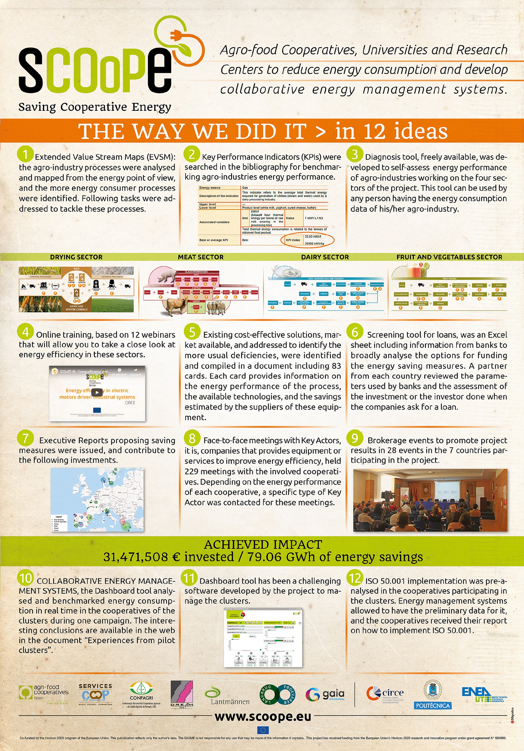 The knowledge repository issued by the project will surely help to improve energy management in agro-food sector and not only in the four subsectors in which SCOoPE was focused. In addition to the auditors trained during the project, more people has leveraged from Webinars and public documentation of the web for improving skills on energy efficiency.