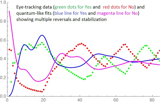 Regarding the project strand corresponding to rumination, we created scenarios for which the hypothetical protagonists were faced with a complex decision (e.g. how to spend their Friday evening), with multiple, non-matched pros and cons for each of the two decision outcomes. Participants were asked to consider this information and reach a decision. We developed two ways to measure the extent of rumination. First, we employed a technology called mouse-tracking, which keeps track of mouse movements. By using a presentation format which allowed viewing of the arguments for each decision outcome only when the mouse moved in different screen regions, we could measure how participants drifted across different sets of arguments. Second, with collaborators in Germany and Switzerland, we created an eye tracking version of the experiment, such that we continuously tracked eye fixations as participants considered the available information. The latter provided a richer data set, which we have modelled with a QPT framework for dynamical change. An innovative aspect of this framework is that it incorporates open system dynamics. In QPT, dynamical change with open system dynamics is characteristic of situations where the system interacts with its environment. Psychologically, such situations are ones for which the consideration of a problem is not restricted to problem-specific information, but is also influenced by the general knowledge/ experience of the decision maker. Our main results were that in many cases participants’ deliberation shows evidence of rumination (multiple cycles concerning the consideration of one set of arguments vs. the other) and that the dynamical pattern of rumination was also consistent with oscillation followed by stabilization – this latter characteristic indicates open-system dynamics. We provided a sophisticated open-systems QTP model for these results, showing that the dynamics of QPT (including the open systems elaboration) provide a good framework for modelling rumination. A notable aspect of the QPT model fits was that, in some cases, QPT model parameters could be employed to predict the eventual participant decision. This is a significant finding, since it is surprising that eye tracking structure can be related to decisions (only the gaze cascade effect has provided any indication that this might be the case so far).