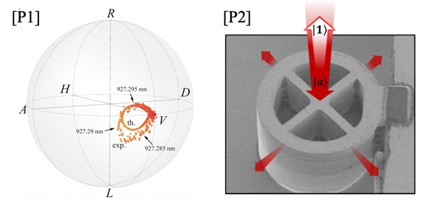 In the first approach, the final aim is to perform a polarisation rotation of 90 degrees of a single photon after interacting with a single charged QD (i. e., from horizontal polarisation before arriving to the device, to vertical polarisation after exiting the gate). The experiments performed during this project consisted on using a neutral QD in a cavity to study the polarisation rotation of a reflcted beam of photons resonantly exciting the device. The main result of these experiments is plotted in Fig. 1 [P1] (from Ref. 2): by changing the relative energy detuning between the QD-cavity system and the laser beam, the polarisation of the reflected beam is rotated by 20 degrees in the Poincare sphere.