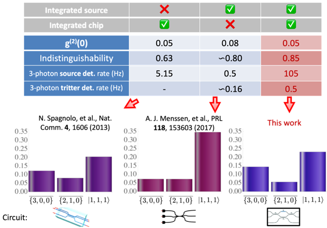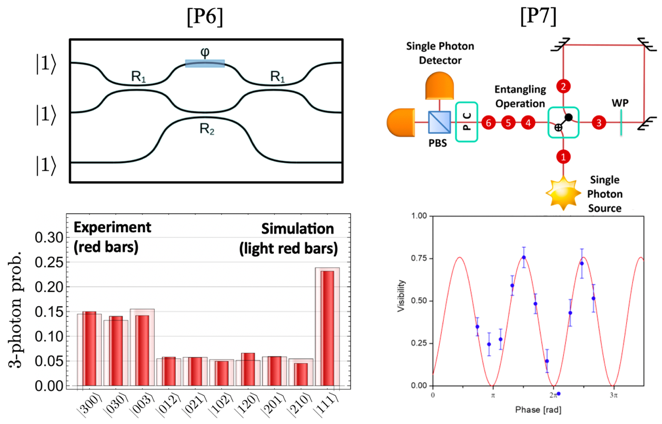 Benefiting from the excellent efficiency of our single photon sources, we have proposed in [P6], and for the first time in Europe, an experimental proof-of-concept scheme for interconnecting two integrated platforms of single photon emission (using our QD-cavity devices) and reconfigurable single photon chips on glass (a three-input photon chip). The three photon interference has been experimentally implemented in the groups of Prof. Sciarrino [9] and Prof. Walsmley [10], using non-integrated sources and circuits, respectively (as opposed to our approach). A major advantage for the success of this project has been the collaboration from the groups of Profs. F. Sciarrino and R. Osellame (Italy). The deliverable of this project in preparation.