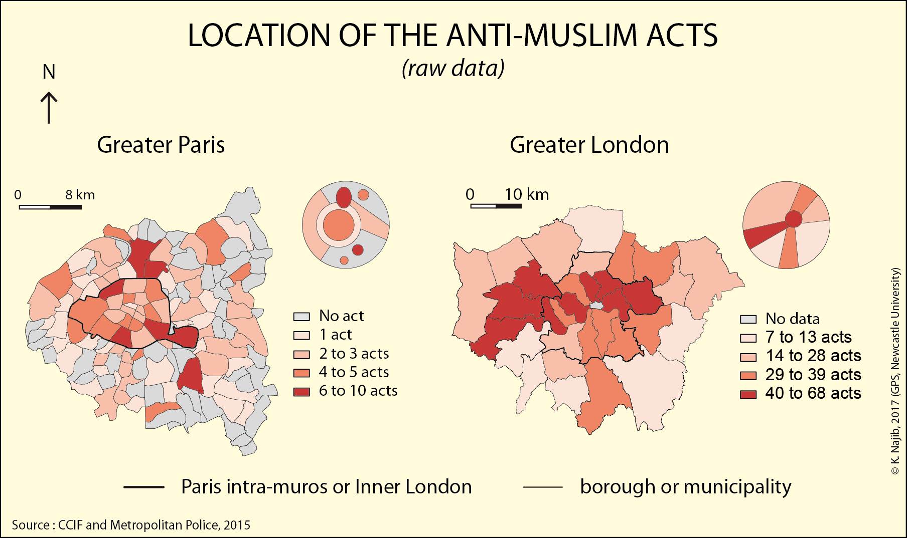 These two maps have also been exposed in an article entitled ‘Where does Islamophobia take place and who is involved? Reflection from Paris and London’ submitted by Dr Najib and Professor Hopkins to a special issue of Social and Cultural Geography on ‘Geographies of Islamophobia’ co-edited by Dr Kawtar Najib and Dr Carmen Teeple Hopkins. This special issue is based on organised sessions at the Association of American Geographers 2017 in Boston, and brings together a range of international contributors (established scholars as well as early career researchers) whose research engages with Islamophobia in different contexts (e.g. Europe, United States, and Australia).