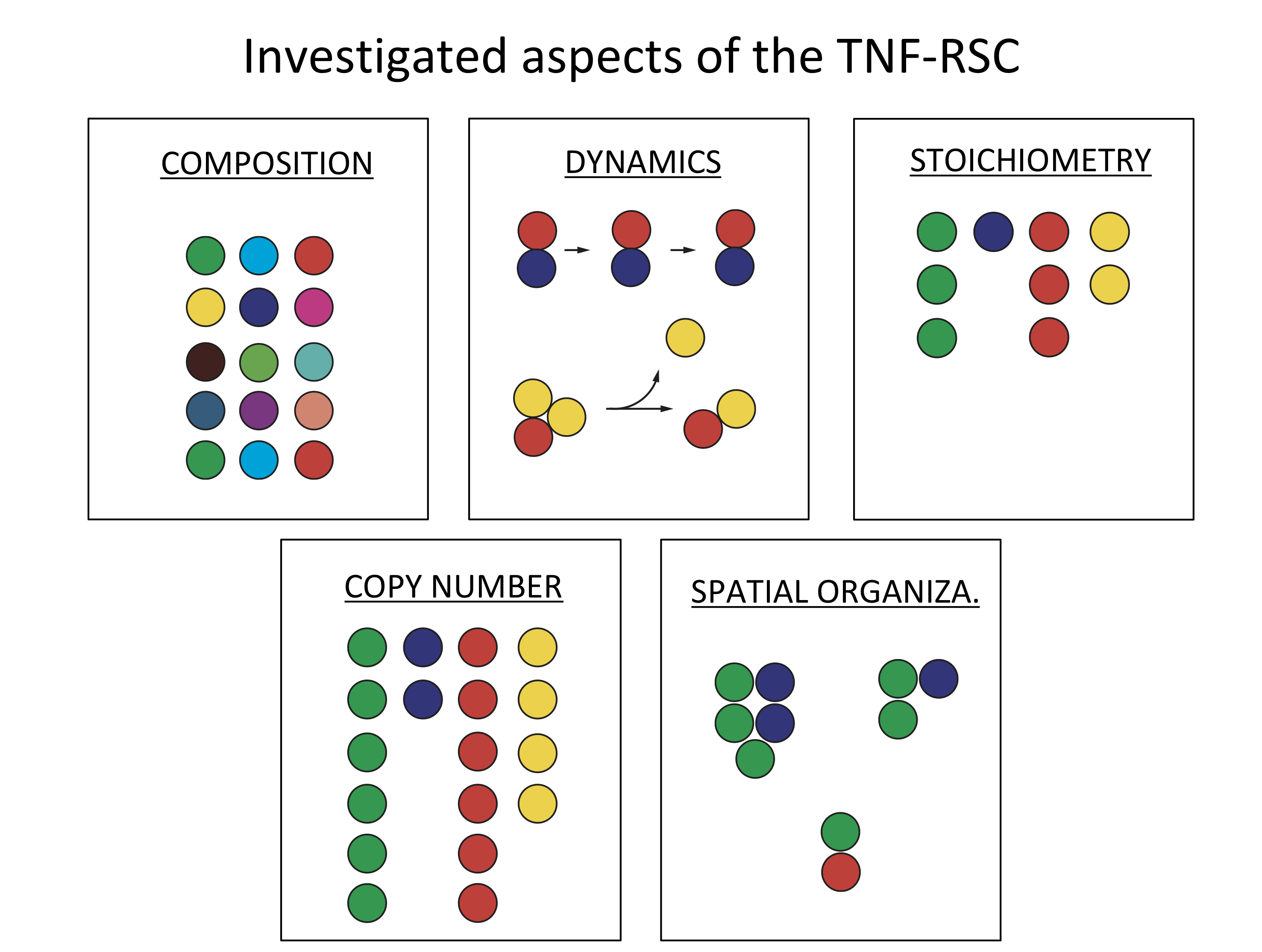 From a biological point of view, we have learned already that new previously unreported members of the TNF-RSC exist, and we have characterised some of their properties (e.g. interactors) and started elucidating what effect they may have on TNF signaling and by what means. Furthermore, we have now a complete overview of the relative stoichiometries of all subcomplexes the TNF-RSC is comprised of, and we are in the course of integrating information obtained from the described approaches to define an absolute composition and size of the TNF-RSC.
