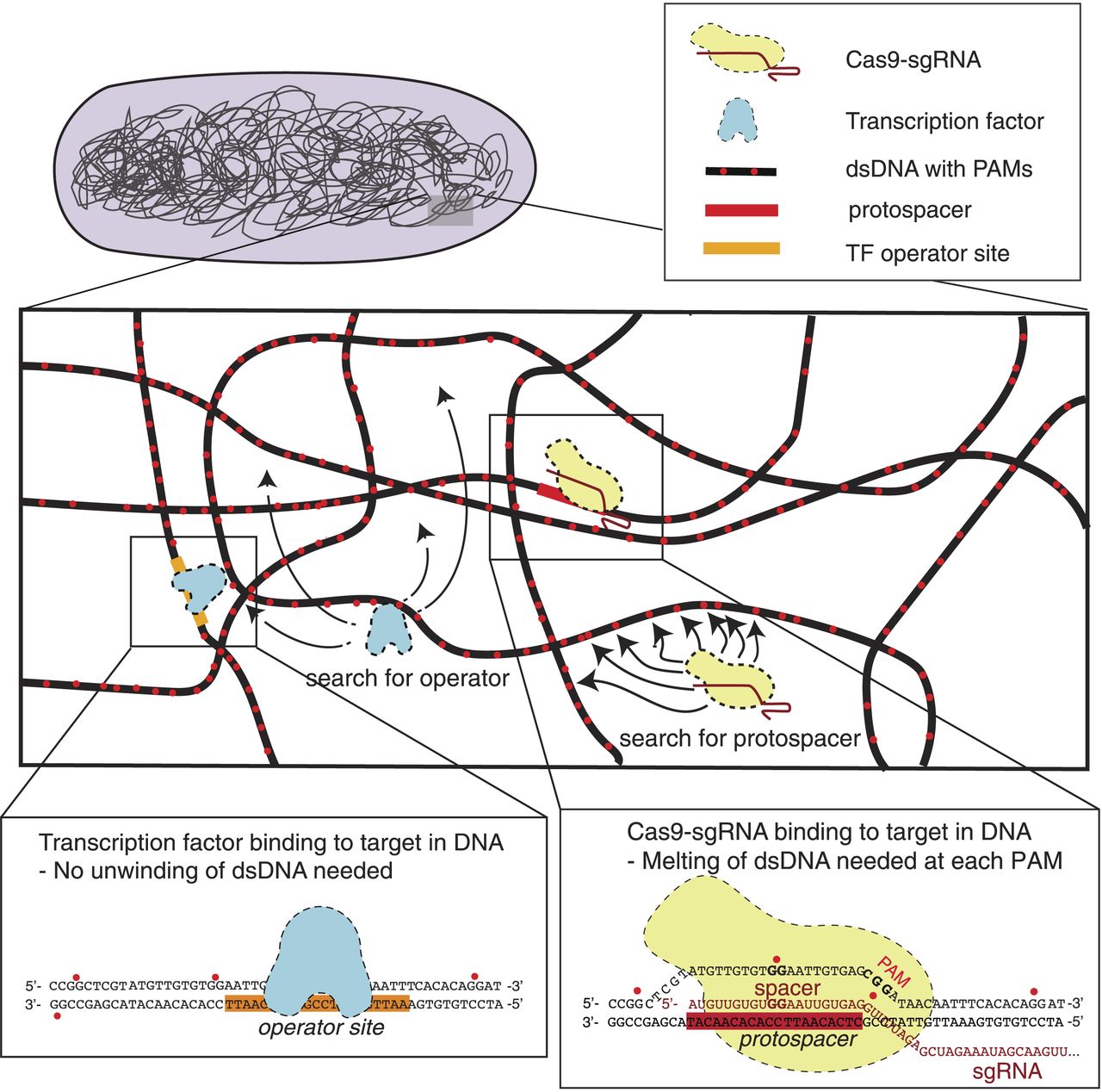 In the case of CRISP/Cas9 we expect the search time to be significantly longer. The reason for this is that the protein-nucleic acid complex does not simply rely on interactions in the DNA groves to find the target site, but actually needs to unwind the double helix and interrogate the DNA sequence to discriminate right from wrong. The search problem is somewhat reduced by the fact the potential targets are defined by the presence of a PAM sequence, but still presents a daunting task.