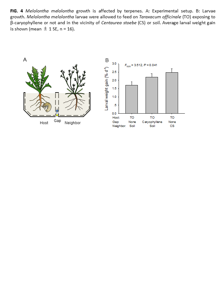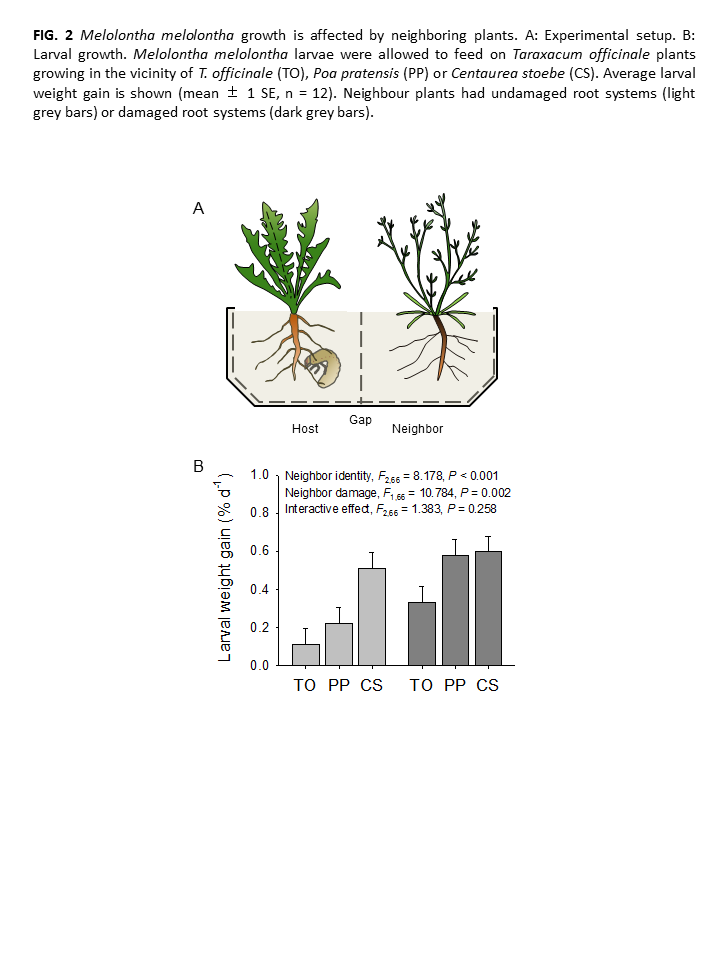 Basically, I have fully reached objective (1) and (2) and made significant progress towards three over last two years from March 1, 2016 to September 30, 2017. I found that neighboring plant significantly affected T. officinale root defenses, which in turn influenced the performance of M. melolontha larvae feeding on T. officinale. This associational effect was triggered by both root volatile and exudates released by neighboring plant. Terpenes were identified as major active singles. So far, one paper entitled “Neighbourhood effects determine plant-herbivore interactions below-ground” has been published in Journal of Ecology in 2017 and also presented as a poster in 16th Symposium on Insect-Plant Relationships in France, one manuscript is being under review in Functional Ecology, and some raw data is being processed.