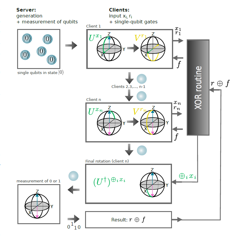 I have then examined the case of classical computation and how quantum information can boost the capabilities of participants. The two resulting papers studied the setting where by the use of a single qubit, we can achieve non-linear computation, both deterministically and probabilistically, without having access to a non-linear classical process. Our method harnesses quantum resources to increase the computational power of the individual parties. Furthermore, in collaboration with the University of Oxford, we experimentally demonstrated how a set of clients with access to only classical XOR gates and singlequbit gates on quantum states can compute a specific example of a multiparty function, the pairwise AND, in a proof-of-concept implementation using photonic qubits.