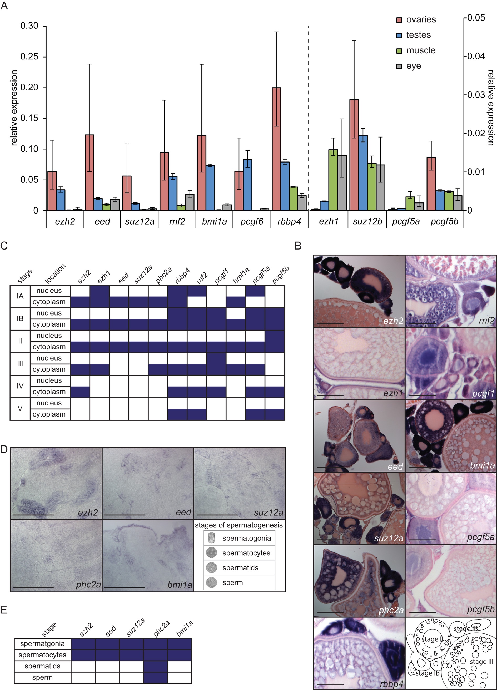 Figure legend: Expression of the majority of the PcG genes that were tested is enriched in the adult germ line.(A) Relative expression assessed by RT-qPCR. Error bars indicate standard deviation. (B) Spatio-temporal expression of genes in adult ovaries. Scale bar: 100 μm. (C) Expression of the PcG genes in different stages of oogenesis. (D) Spatio-temporal expression of ezh2, eed, suz12a, phc2a, and bmi1a in adult testes. Scale bar: 100 μm. (E) Expression of the PcG genes in different stages of spermatogenesis.