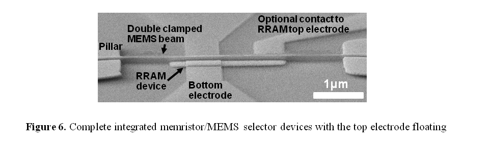 The selector design from WP3 was modified to accommodate the memristor from WP2. After the bottom electrode fabrication, another additional e-beam lithography step is performed to deposit the active layer and top electrode of the memristor device. The integrated device then follows the same steps as the single NEMS selector: SiO2 deposition, planarization, beam patterning and release. The integrated memristor (Fig 6) showed improved non-linearity, but future work will focus on hermetic device encapsulation since the devices were affected by humidity and stiction.