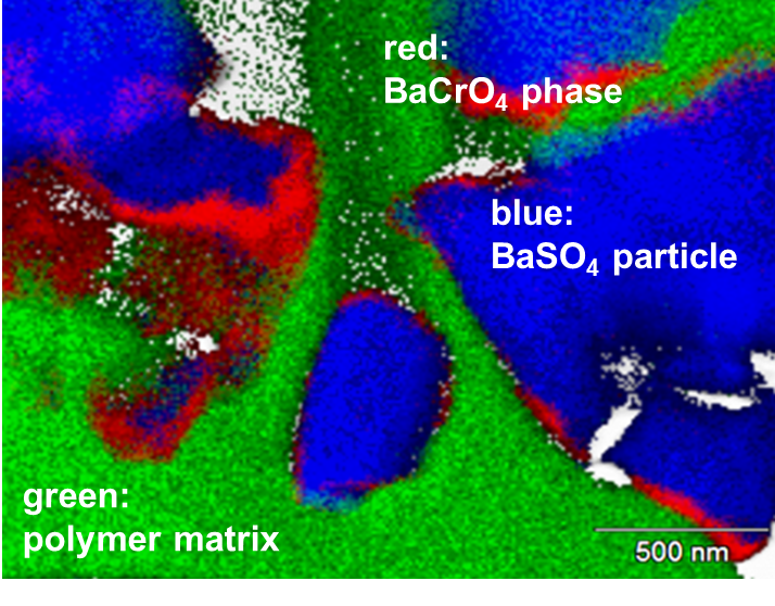 In the second part of the investigation polymer films, with (filled) and without (unfilled) non-functional particles (fillers) of barium sulfate (BaSO4) or titanium dioxide (TiO2), were exposed to sodium chromate solution to study ion uptake and the formation of alternative migration pathways in the coating (ions-in). The chromium concentration in the unfilled polymer after exposure was determined by ICP-MS (Inductively Coupled Plasma-Mass Spectrometry). LA-ICP-MS (Laser Ablation-ICP-MS) was used to confirm chromate penetration into the films and to track the location and concentration of Cr on a micron scale. Furthermore, higher resolution (nm scale) data on the distribution of Cr in the films after exposure was delivered by TOF-SIMS (Time of Flight-Secondary Ion Mass Spectrometry) analysis. It was shown that chromate penetrated the polymer matrix only under specific conditions when the polymer was affected by temperature or solvent. Furthermore, Cr was confirmed to be located in specific channels inside the polymer film. SEM-EDS and STEM-EDS were used to investigate Cr location in the films with fillers after exposure. The addition of pigments (TiO2 or BaSO4) influenced the chromate transport in the coating. TiO2 particles did not actively contribute to the chromate transport by dissolution but transport pathways were available at the particle/matrix interface. BaSO4 particles however, were shown to actively contribute to the transport mechanism. Filler particles were partially dissolved under exposure conditions while chromate ions penetrated the polymer via the particle/matrix interface, resulting in precipitated barium chromate (BaCrO4) observed at the surface of the BaSO4 particles as shown in Figure 1.