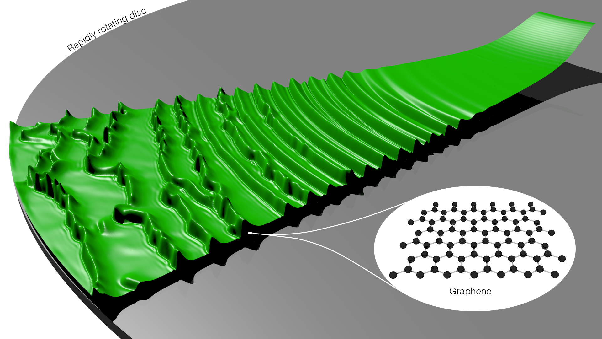 Using a combination of direct numerical simulations and experiments, an unprecedented level of detail on complex interfacial, thin film flows has been obtained. These insights have been used to investigate important spinning disc parameters for graphene exfoliation. It also has general relevance to other production applications (i.e. pharmaceuticals). A critical exfoliation criterion, describing the strain rate necessary to produce graphene from graphite in a solvent suspension, has been quantitatively confirmed. Prior to this work, the criterion was based on qualitative microscopy measurements. Although a critical strain rate is necessary to exfoliate two-dimensional nanomaterials, the residence time of the production process was found to have an equally significant influence on production output. There have been additional project innovations, with broad academic and industrial relevance, that notably exceed the original project objectives. This includes the development of: 1. A novel liquid phase exfoliation technique that delivers an order-of-magnitude increase in production output compared to batch production techniques currently used by industry; and 2. A real-time graphene production monitoring system, and demonstration of Internet-of-Things (IoT) integration towards deployment in an Industry 4.0 environment. The combination of novel scientific outputs with practical innovations, has already resulted in a sufficient research maturity to engage leading European manufacturing companies. These interactions will ensure translation of the research outputs into industry and for the benefit of society.