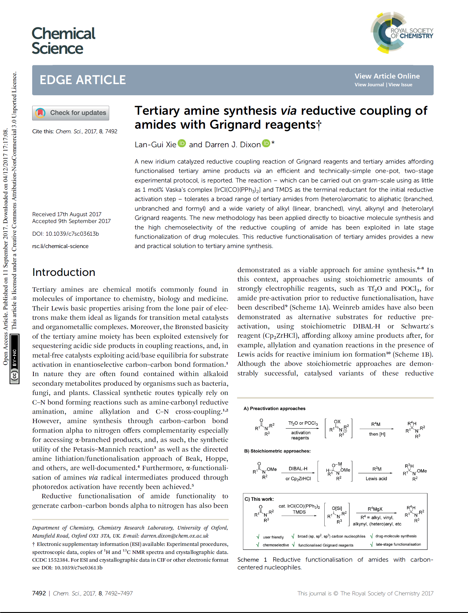 Lan-Gui Xie; Darren J. Dixon. Tertiary amine synthesis via reductive coupling of amides with Grignard reagents. Chemcal Science, 2017, 8, 7492-7497.