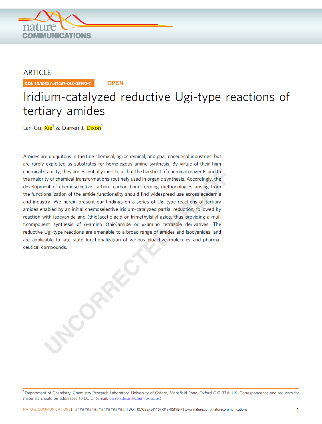 Lan-Gui Xie; Darren J. Dixon. Iridium-catalyzed reductive Ugi-type reactions of tertiary amides. Nature Communications, 2018, DOI: 10.1038/s41467-018-05192-7.