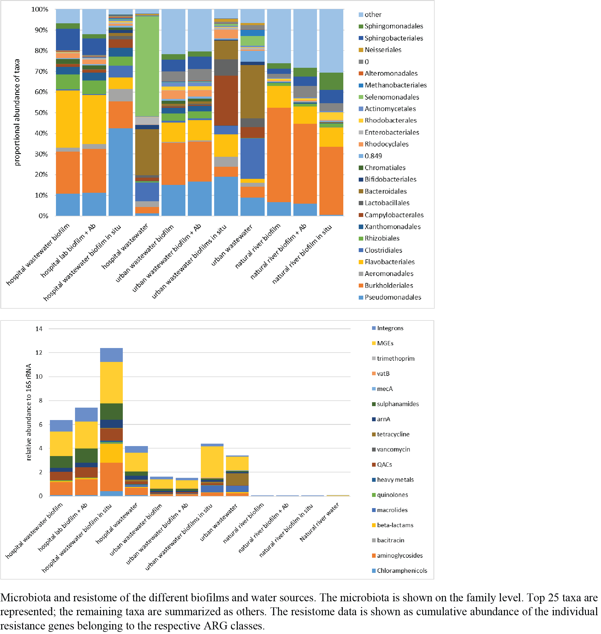 Two biofilm models were employed in order to tackle the main research objectives of this project: Biofilm model 1- Monospecies biofilms composed of one strain carrying a known MGE-promoter-lux fusion allowing by means of measuring luminescence whether the expression of these MGE-promoters is affected by different wastewater effluents. Biofilm model 2- Natural biofilms grown from wastewaters (hospital, urban). Those biofilms are likely to be composed of multispecies and closely model environmental in vivo situations. Main objectives were to determine the bacterial compositions of those biofilms, screen for MGEs and ARG content and test whether the expression of MGE-promoters is affected by antibiotics by means of meta-transcriptomics. The aim of implementing biofilm model 1 was to assess the potential inductive role of antibiotics and effluents in HGT associated with AMR, in biofilm cultures. A screening method using a luminescence reporter system has been implemented to screen for the expression of eleven promoters of genes carried by the SGI1 element of Salmonella enterica, which is associated with AMRs. The chosen promoters are known or suspected to be involved in transfer function. The luminescence expression has been measured in Escherichia coli and S. enterica strains carrying the plasmids with the reporter fusions. The effect of exposure to ciprofloxacin and hospital effluents was tested. Our preliminary results indicate that SGI1 promoters involved in HGT are differently expressed in biofilm, while expression of some promoters was further induced in SGI1 positive clones. Remarkably, ciprofloxacin and hospital wastewater mediated promoter gene expression seems to be repressed in SGI1 positive clones, indicating that the presence of a chromosomal copy of the SGI1 element interferes with potential regulatory induction of SGI1 promoters by ciprofloxacin and hospital wastewater. To address the questions as to whether multi-species biofilms (Biofilm model 2; grown in hospital and urban wastewater and natural surface water environments) play an important role in the dissemination of ARGs, a new model has been implemented. Natural biofilms from wastewaters (hospital, urban) and river water were grown on polystyrene slides for 7 days, directly in situ in the water sources of the respective sites (hospital wastewater pipe, urban wastewater treatment plant, natural river) and in the lab by means of a continuous culturing system using water collected from the various sites. Biofilms grown in the lab from each water type were compared to their lab replicate treated with antibiotics and to their in situ counterparts with respect to their: bacterial composition, MGEs and ARGs content, and their transcriptomes focusing on the expression of MGEs and ARGs. Distinct signatures for the studied biofilms and waters were identified, clearly separating the different sources according to their microbial make up. Preliminary analysis indicates that biofilms do share the microbiota with their originating respective water sources (hospital, urban and natural river wastewater), but in differential proportional abundance giving clues on which bacterial taxa are more successful and dominant in the respective biofilms. The resistome (representing 15 resistance gene classes, heavy metals, mobile genetic elements and integrons) analysis indicated that for the hospital biofilms, all but one of the detected ARG classes (tetracycline) were more abundant in biofilms from hospital wastewater compared to hospital wastewater itself. For Urban wastewaters this trend was similar; for 10 ARG classes the in situ urban biofilm was richer in ARG content compared the urban wastewater. The river biofilms and river water contained significantly lower levels of ARGs compared to the urban and hospital wastewater biofilms. Strikingly, MGEs and integrons are highest in all biofilms from all sources compared to the wastewaters, indicating that integrons are abundant in wastewater and natural biofilms. Finally, the 16S rRNA data and resistome data will also serve as a tool to deepen and correlate the ongoing meta-transcriptomic analysis. In addition, an approach by confocal microscopy was developed in order to visualize and study structural matrix components and the architecture of wastewater (hospital, urban) and river biofilms. Extracellular polymeric substances (EPS) such as external DNA (eDNA), which are important structural components of the biofilm matrix, are associated with resistance to antibiotics and the promotion of horizontal gene transfer. Preliminary results clearly showed that the matrix and structural architecture of these mature multi-species biofilms differs according to their environment and is significantly impacted when exposed to antibiotics (ciprofloxacin). Complementing our genomic approaches by advancing high-resolution confocal microscopy is a novel approach and as we identified, an important gap in unravelling the role of wastewater and river biofilms as environmental hotspots for the dissemination of ARGs.
