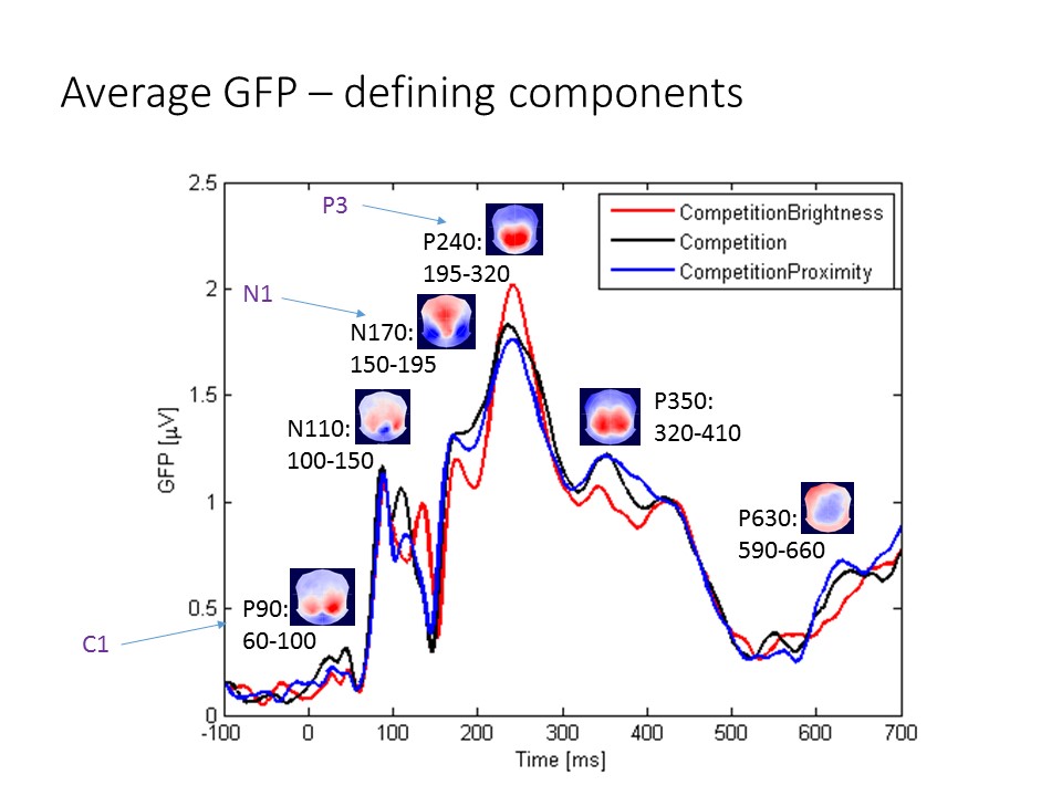 The second part of the project has been conducted starting the second year. In this part, participants performed a computerized task, similar to the one used in the behavioral part, only they were connected to an electroencephalogram (EEG), which records brain waves from electrodes placed on the scalp. The Global Field Power (GFP), representing the standard deviation across all electrodes, was extracted for each time point. The GFP measure has the advantage to be reference independent. Using the GFP we defined Event-Related (ERP) components indicating stimulus related activity. These components were then tested for differences in amplitudes in correlation with the experimental manipulation. Preliminary results of these analyses suggest one component to be specifically involved in the competition process. In addition, inverse solutions for source localization was computed using the Local Auto-Regressive Average (LAURA) algorithm. The method is known as Distributed Electrical Source Imaging and estimates the underlying current densities. The data is also being analysed with frequency analysis methods to reveal whether there is a change in frequency power in the time-course of the competition.
