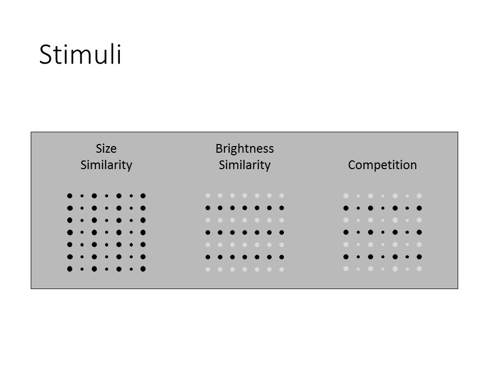 Paradigm – we used primed-matching paradigm, in which the participant was asked to respond to a pair of test figures following a prime stimulus. The participants’ task was to indicate whether the two test figures are identical, or were they different from one another. The figures in the test-pair could be similar or dissimilar to the prime in the organization they depicted. Thus, although the task did not involve the prime, if a representation of the organization in the prime was constructed, then it should have facilitated responses to a test-pair that was similar in organization to the prime, compared with when it was dissimilar. To measure dominancy of representations, dissimilar test-pairs of one organization in the prime stimulus were also similar to the other organization. For example, if the prime presented columns by one grouping principle (e.g. proximity) and rows by another (e.g. brightness similarity), then a test-pair of columns was dissimilar to the latter organization but also similar to the former. Priming effects were calculated as the difference in facilitation between ‘same’-responses to similar and dissimilar test pairs according to one of the organizations in the competition. Thus, positive priming effects indicate that one organization was better represented than the other, negative priming effects indicate that the latter organization was better represented than the first, and absence of priming effects indicates that the two were represented to the same degree (i.e. competition between representations).