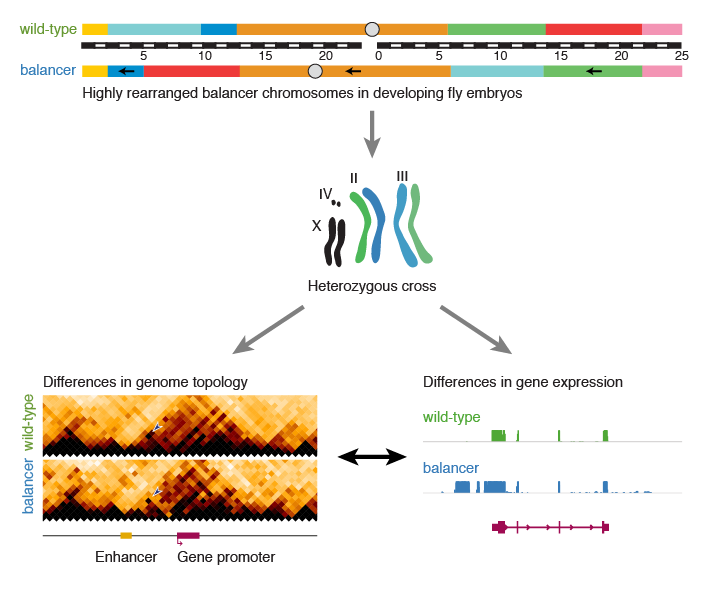 To investigate the relationship between genome topology and gene expression, we utilized highly rearranged balancer chromosomes, which contained eight large nested inversions, thousands of smaller structural variants, and hundreds of thousands of single nucleotide variants. We then assessed the impact of these genomic rearrangements on genome topology and gene expression in cis, using a heterozygous cross (balancer over wild-type), which minimizes the contribution of trans effects. For this purpose, we performed allele-specific Hi-C and RNA-seq experiments on F1 embryos.
