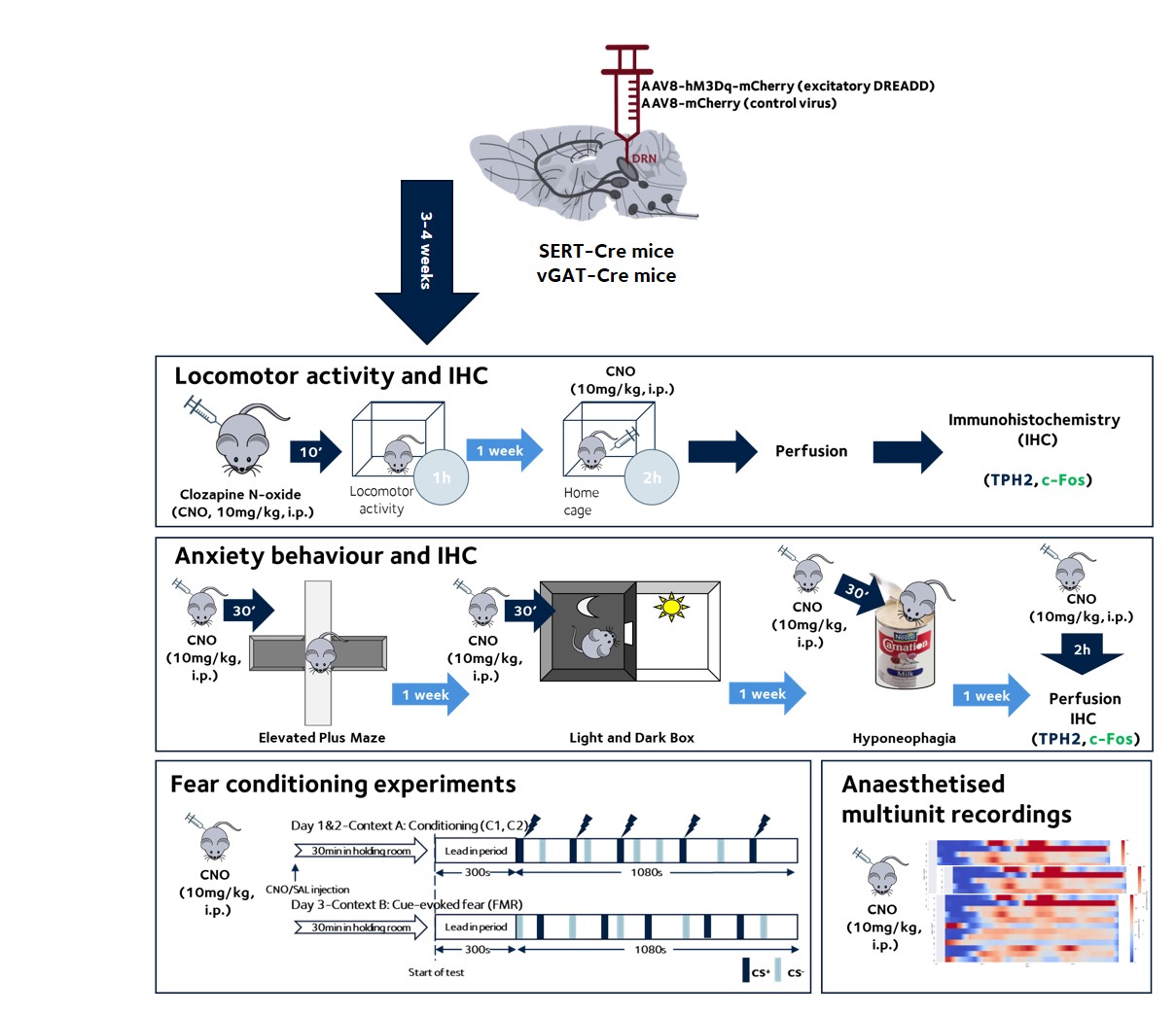 Together, the data obtained in this project indicate the successful chemogenetic targeting of DRN serotonin neurons to explore the role of serotonin circuitry involved in anxiety and fear behaviour but that the role of DRN GABA neurons may be more important to the control of emotional behaviour than the serotonin neurons themselves. These results will help better understand the mechanisms underlying the control of emotional behaviour and may contribute to identify better candidates for treatments aimed at ameliorating psychiatric conditions in which emotional behaviour is altered.