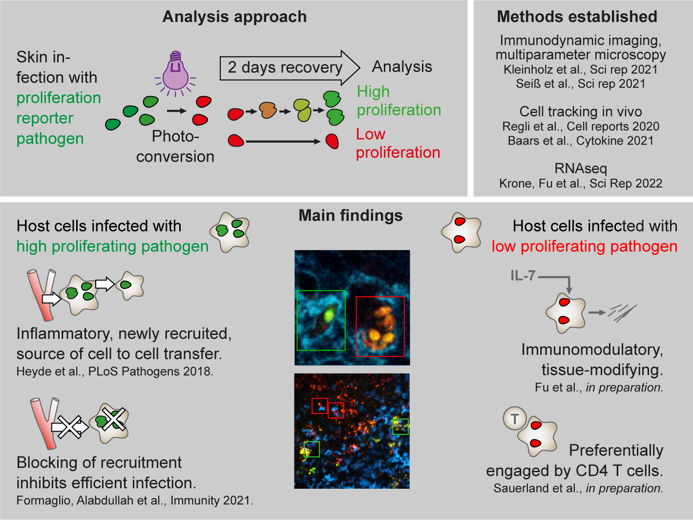 In order to elucidate the interplay between pathogen proliferation and the dynamics and plasticity of the immune system, used a biosensor that permits measuring the growth rate of the microbe Leishmania major in real-time and in the ongoing infection. This enabled us to determine (1) whether fast versus slow growing pathogens occupy different cellular niches in the infected individual, (2) whether immune cells show a differential behavior when confronted with microbes of different growth rates, and (3) how molecular activation signals and the metabolic state of immune cells are connected to the growth activity of the pathogen.