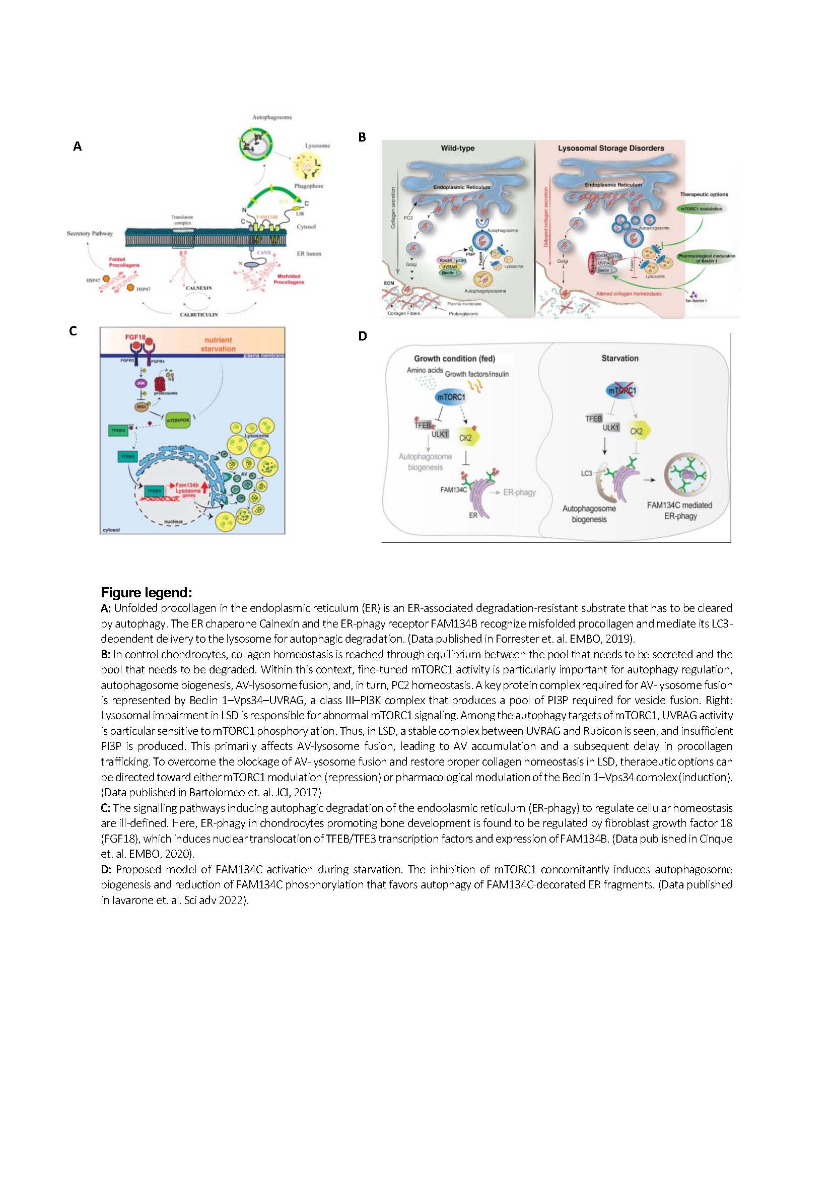 We identified the FGF signaling as a major regulator of autophagy during post-natal bone growth. Mice lacking autophagy showed endoplasmic reticulum (ER) enlargement and misfolded collagen accumulation into the ER, thus leading to disorganized fibrillary network in the extracellular matrix (ECM) and impaired bone growth (26595272). Notably, animal models of Lysosomal Storage Disorders (LSDs), which showed autophagy flux impairment, also showed delayed collagen trafficking through the ER and skeletal defects (28872463). Thus, my laboratory has discovered that collagen is a new autophagy substrate (26595272; 28872463; 30559329). We have also characterized the molecular mechanism underling autophagy activation by FGF signaling in chondrocytes. We have found that FGF18 activates FGFR3 and FGFR4 receptors leading to phosphorylation and degradation of Insulin Receptor Substrate 1 (IRS1), a key player of the insulin signaling pathway, that in turn induced mTORC1 inactivation and the nuclear translocation of the transcription factors TFEB and TFE3, master regulators of autophagy and lysosomal genes. Interestingly, TFEB/3 induced lysosomes biogenesis, but also enhanced the expression of FAM134B gene, which encodes a selective receptor for the autophagy of the ER (or ER-phagy), a specific form of autophagy in which the receptor brings a portion of the ER membrane to autophagosomes thanks to the LC3-Interaction Region (LIR) domain. In chondrocytes the FGF-TFEB-FAM134B axis transcriptionally controls the process of ER-phagy contributing to the quality control of the ER. Animal models lacking ER-phagy (Fam134b-/- Medaka fishes and FGFR3-/-;FGFR4-/- mice) showed ER accumulation of collagen, ER enlargement and skeletal defects (32716134).