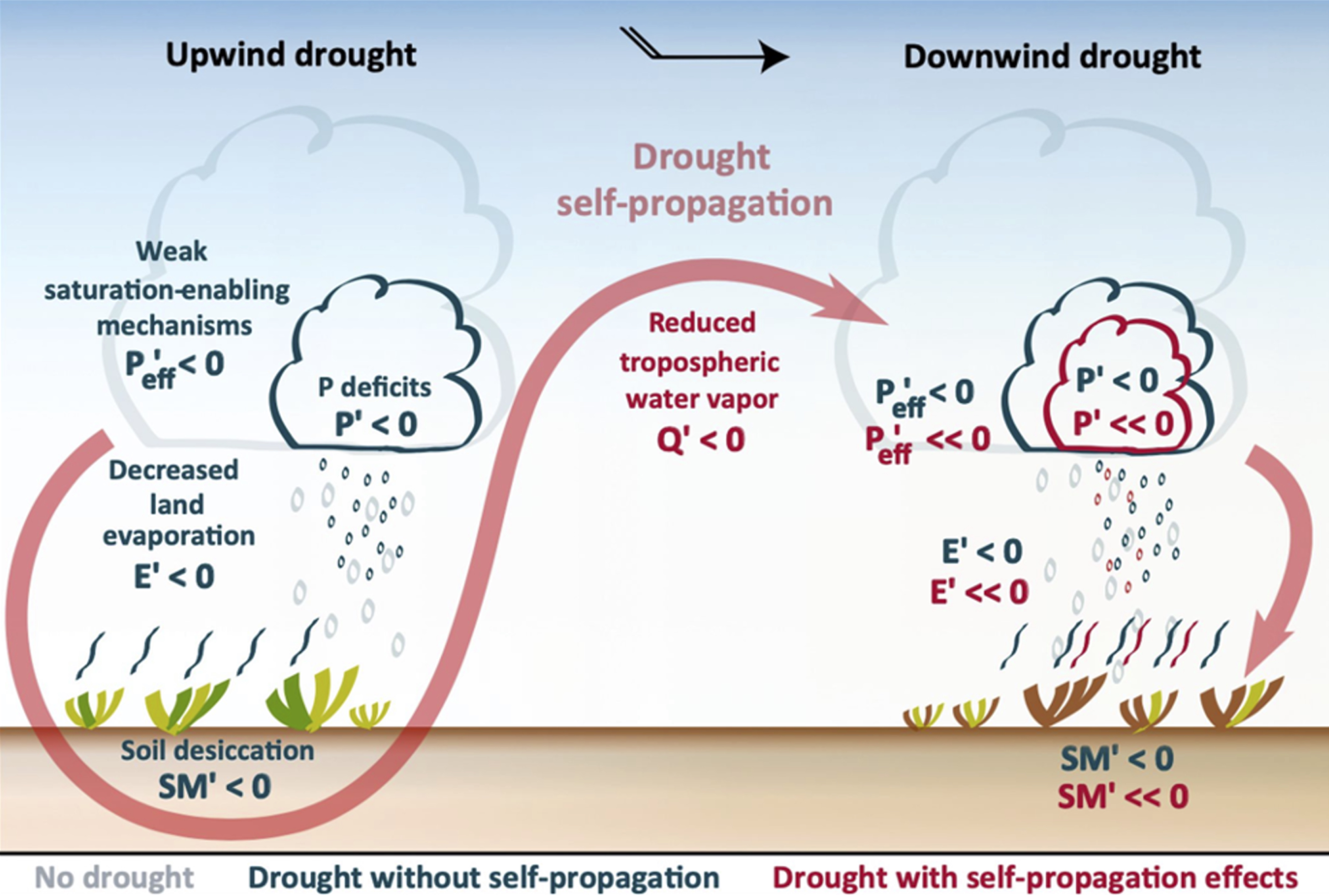A large part of DRY–2–DRY was dedicated to unravelling the effects of land feedbacks on the expansion and concatenation of droughts and heatwaves. Results demonstrated that the paradigm proposed in DRY–2–DRY was indeed valid: droughts and heatwaves do self-propagate. As a soil drought strikes, evaporation is reduced, which contributes to the drying but also the warming of the air. Moreover, the atmosphere reacts in such a manner that it allows the accumulated heat and dry air to persist from day to day. As that warm and dry air flows downwind, it creates a propagation front, leading to the expansion and concatenation of drought conditions. This propagation is fuelled by the soil dryness caused by the drought itself; similar to the propagation of a wildfire. This process of drought 'self-propagation' is especially important in drylands, where it can account for ~20–30% of the precipitation deficits causing droughts – see Fig. 2 (Schumacher et al., 2022). We also demonstrated that this self-propagation applies to heatwaves as well: as heatwaves dry the surface, the enhanced warming over the land is transported downwind leading to their expansion and even to a concatenation of multiple heatwave events – see Fig. 3 (Schumacher et al. 2019). During recent European mega-heatwaves, over 30% of the heat anomaly was caused through this process.