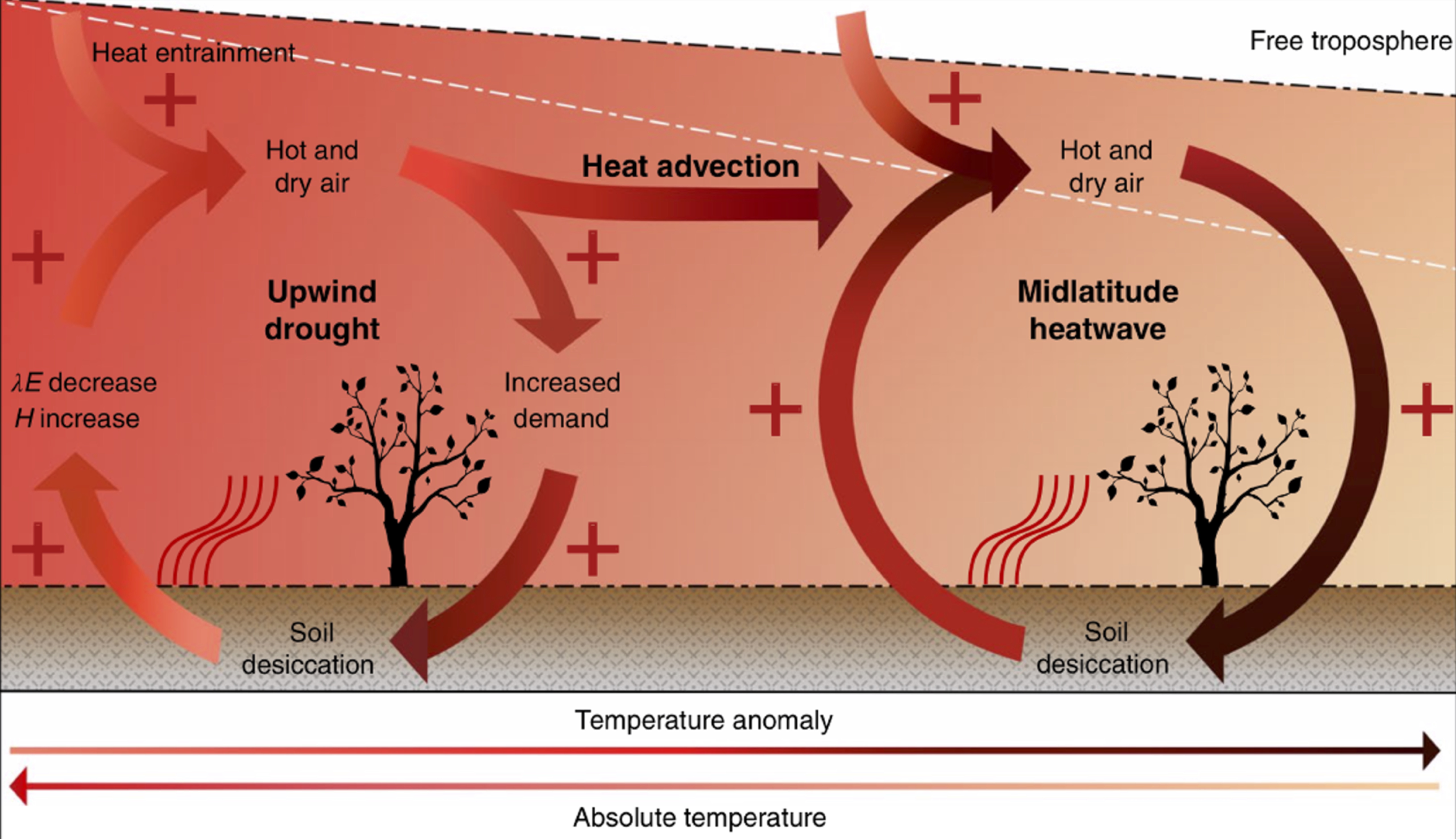 Recent heatwaves frequently coincided with soil droughts, largely due to the feedbacks illustrated in Fig. 1. While this synchronisation with soil drought acts to intensify air temperature, it also lowers air humidity. Using the novel HAMSTER software tool developed during DRY–2–DRY, it was demonstrated that these compound dry–hot conditions are highly detrimental for ecosystem primary productivity as they lead to severe vegetation stress. However, for humans, the situation is different: the lowering of air humidity due to soil drought reduces heat stress, instead of increasing it as it occurs for plants. To understand the net impact of soil desiccation on the human morbidity and mortality of heatwaves, another software tool, called CLASS4GL, was developed within DRY–2–DRY. CLASS4GL combines weather balloon data, satellite observations and atmospheric modelling. The tool was used to disentangle the effects of land feedbacks on the local likelihood of rainfall during droughts and heatwaves. Then, combined with meta-analyses of morbidity and mortality, it was demonstrated that soil drought actually leads to a mild reduction in human heatwave lethality. This finding questioned the efficiency of traditionally proposed mitigation strategies involving surface moistening to increase evaporative cooling, and it gave rise to an interdisciplinary research line to explore the impact of drought on human physiology during heat strokes.
