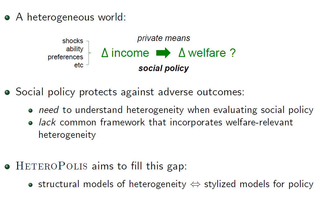 The first part of HETEROPOLIS analyses the use of registry-based consumption measures to evaluate heterogeneity in welfare and exploits a newly developed data set based on administrative registers for the universe of Swedish households providing comprehensive and detailed information on income, wealth, labour market outcomes and other variables. The second part develops and implements a general evidence-based framework to evaluate the design of multi-faceted social insurance programs in a heterogeneous world. The final part of HETEROPOLIS analyses and estimates different sources of heterogeneity that affect market efficiency and justify further government interventions.