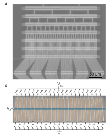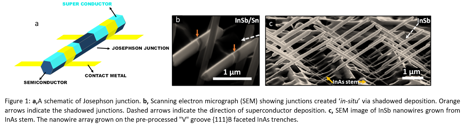 1) Vapor Liquid Solid (VLS) epitaxy is a useful platform for exploring new material combinations without compromising on quality. Typically, an ‘ex-situ’ lithography step followed by etching is required to pattern the superconductor. With conventional ex-situ/top-down processing it is difficult to avoid etching residues and damaged surfaces, which deteriorates the device’s performance. In our research we contrived a new VLS methodology to create a gate tunable Josephson junction ‘in-situ’ via shadowing (Fig. 1b) which can be sued with a variety of semiconductors e.g. InAs, InSb and InAsxSb1-x and superconductor combinations (Al, Pb, Sn). The research has resulted in more than 25 research papers in high impact journals, and several collaborations with leading measurement groups globally.
